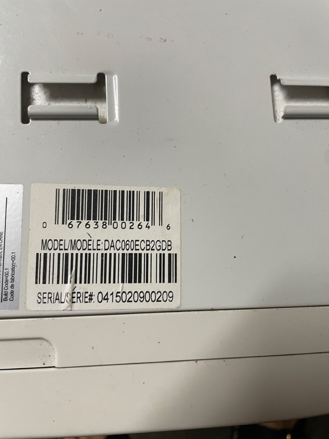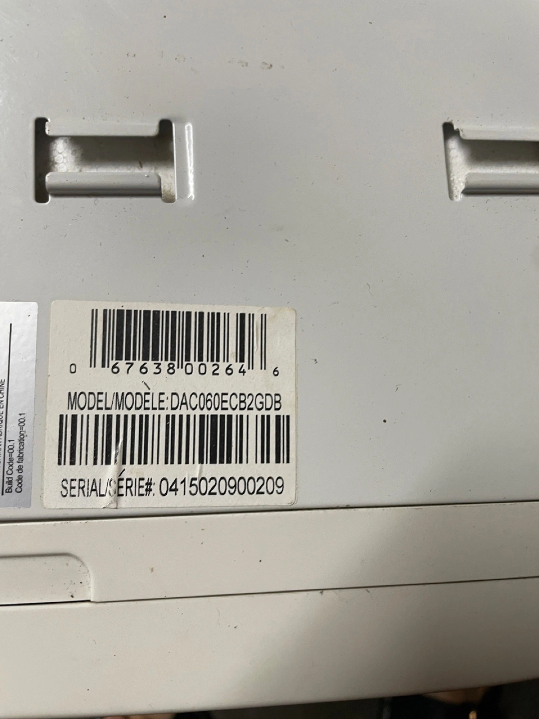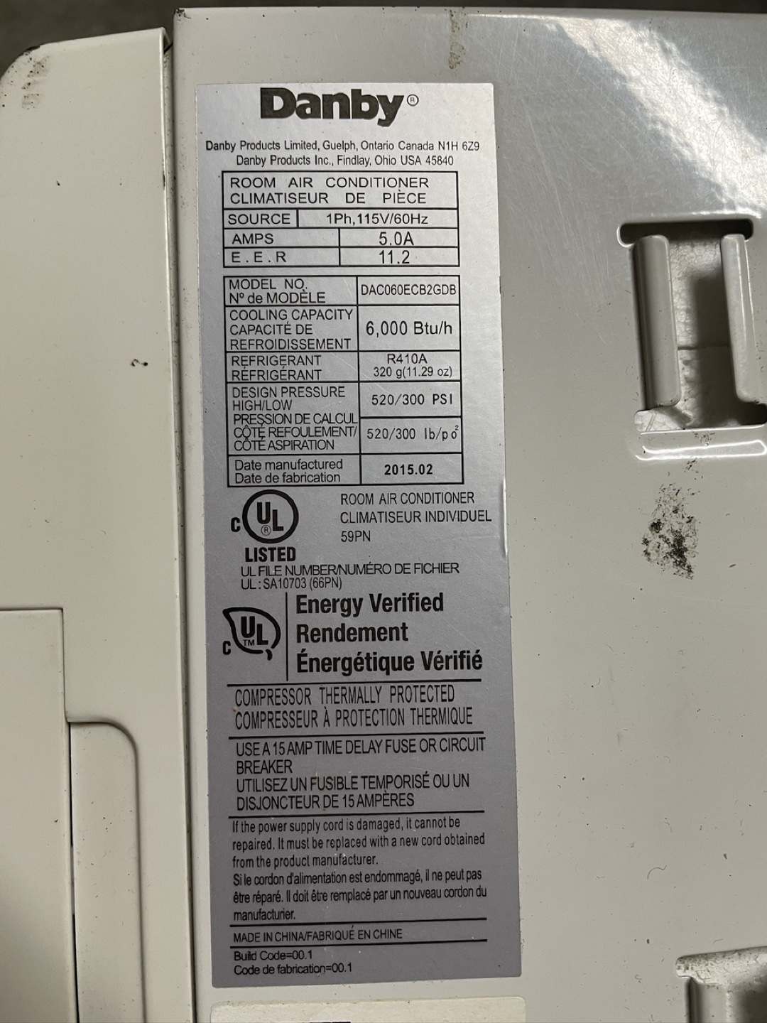 Selling a Danby room air conditioner. It has a cooling capacity of 6,000 BTU/h. It uses R410A refrigerant. The model number is DAC060ECB2GDB. The manufacturing date is 2015 February 02