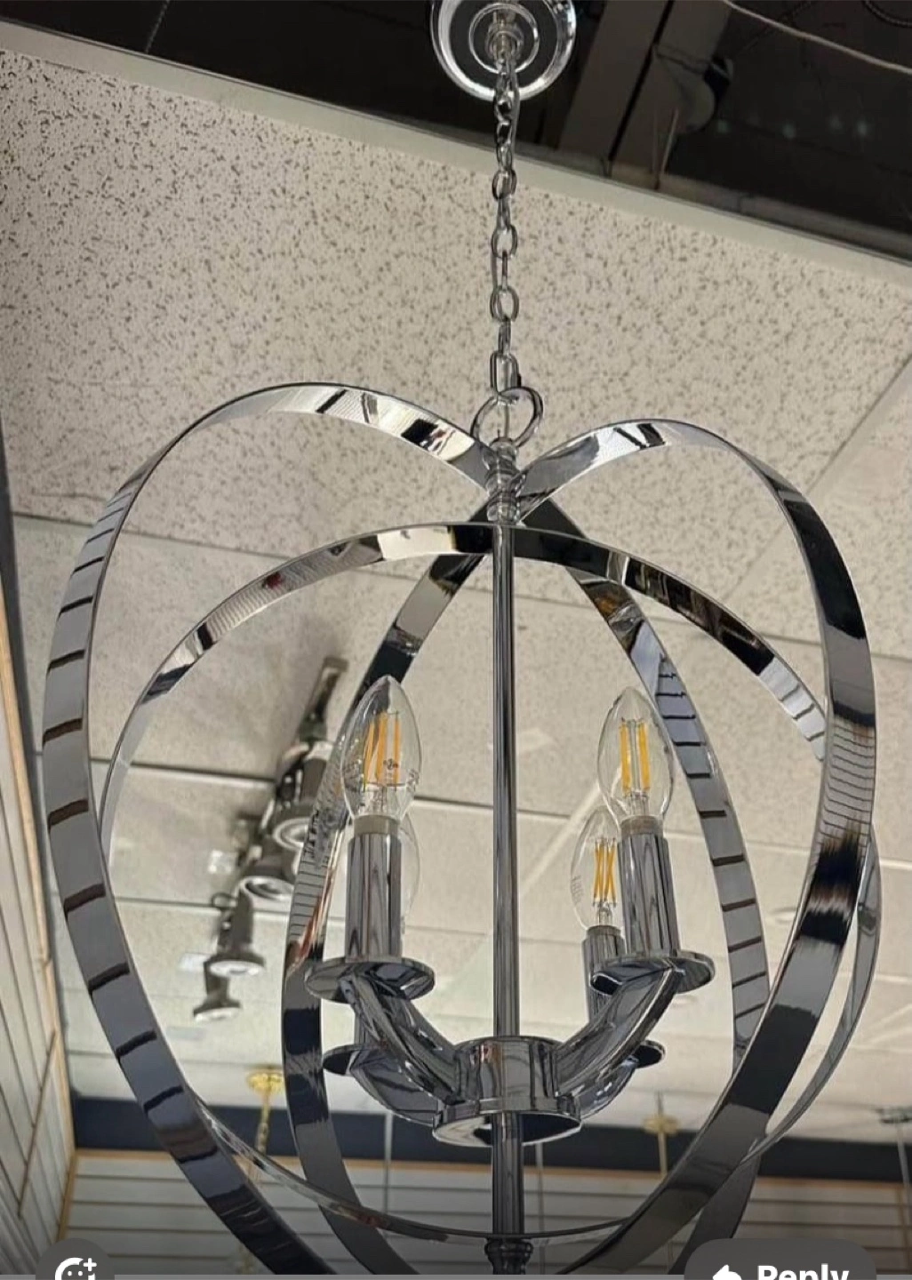 Selling a modern orb chandelier with a polished chrome finish. It's in great condition and would add a stylish touch to any room