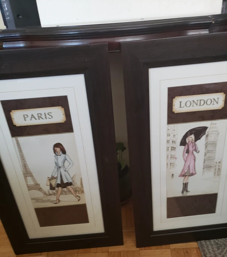 a pair of framed prints from Homesense .bought it $25 each.asking $30 for both.One features a Paris scene with the Eiffel Tower, and the other a London scene with Big Ben. The frames are a dark brown colour. They would look great in any room!