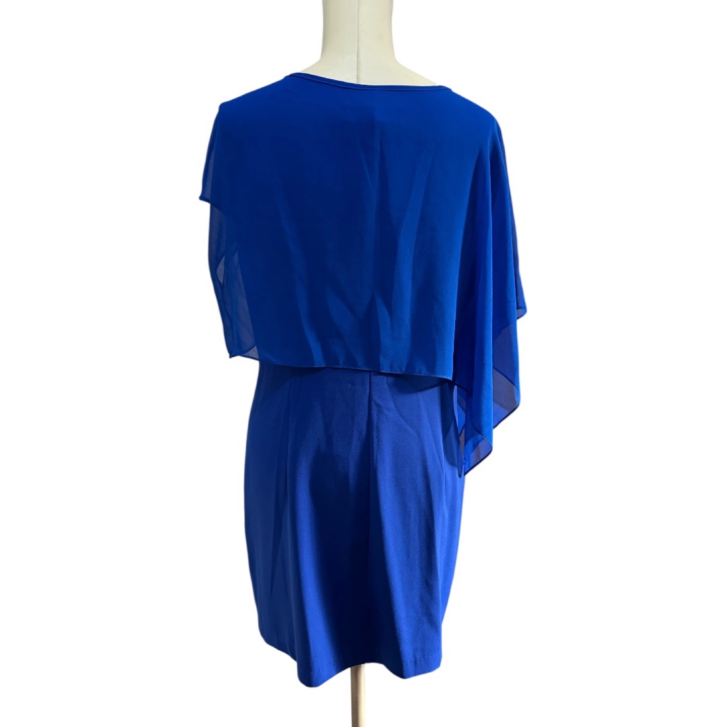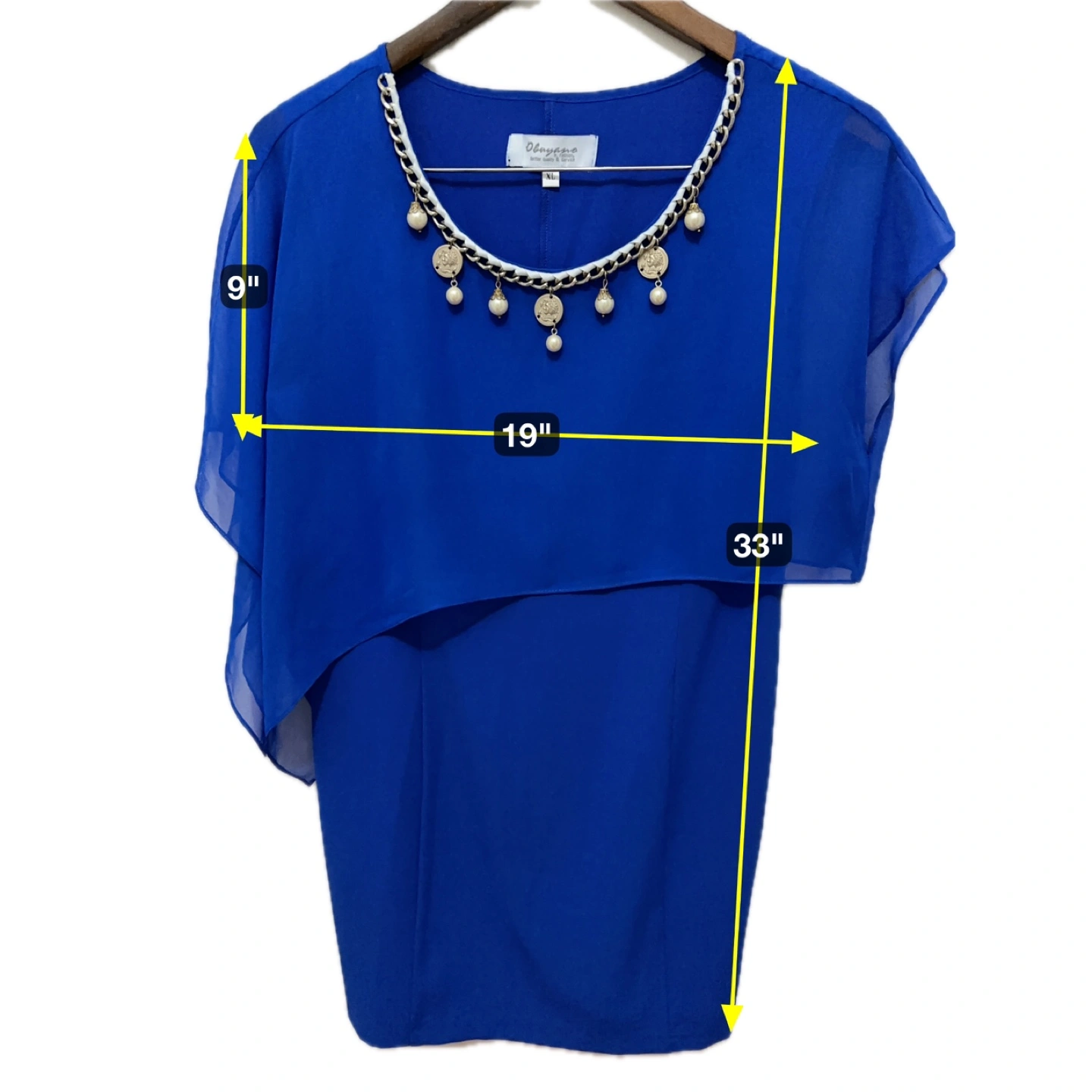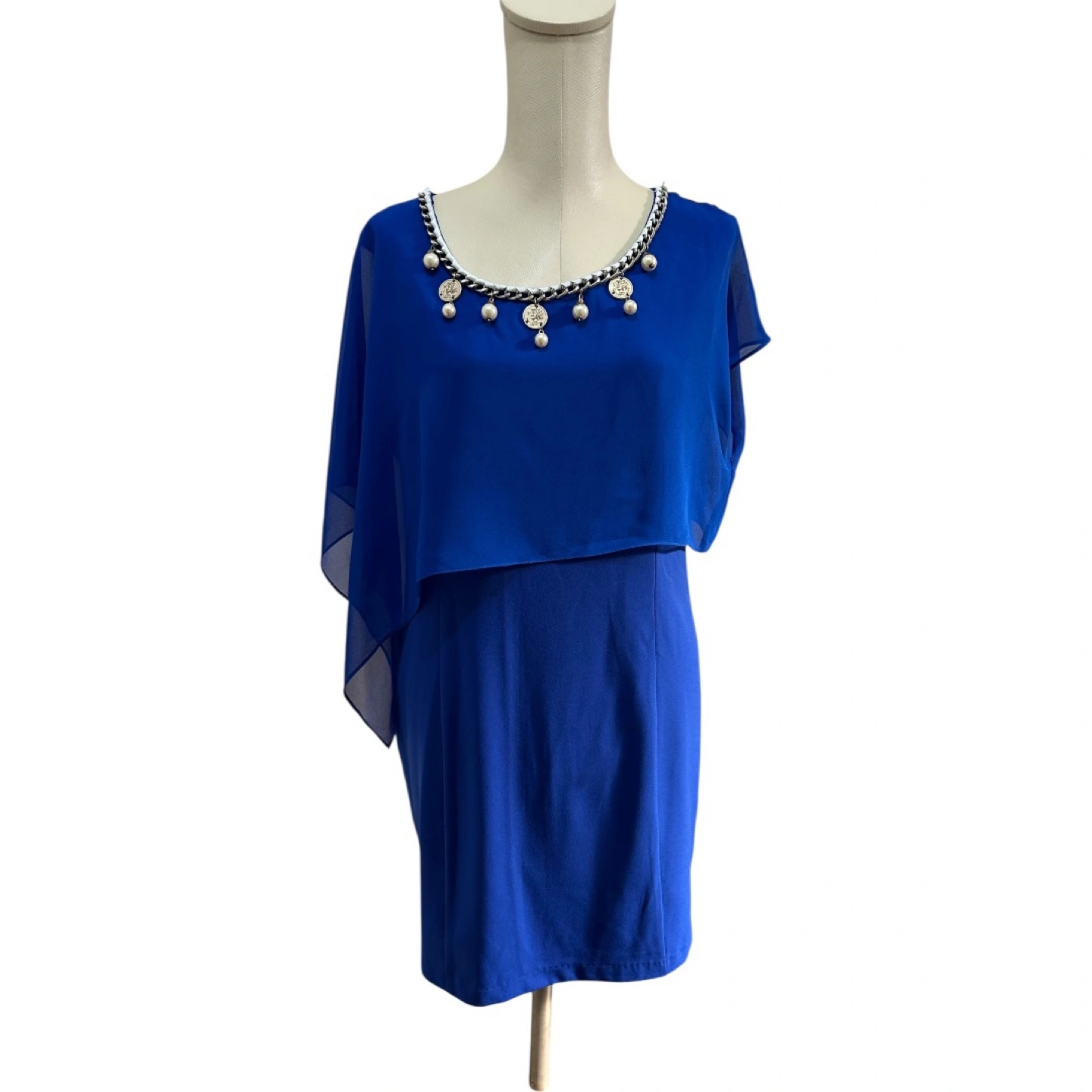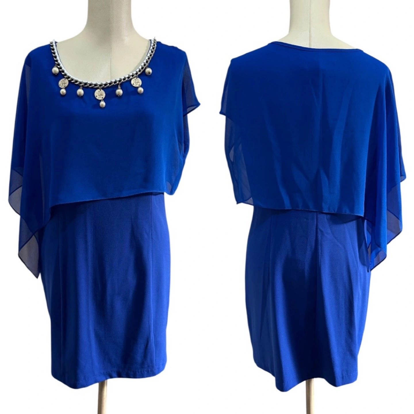 • Color: Deep royal blue • Though labeled XL (Chinese sizing), but it fits like a US Medium. See measurements as below. • Style: Above-the-knee, semi-formal, cape-style overlay • Neckline: Scoop neck with pearl and coin charm embellishment • Condition: Excellent – no snags, stains, or signs of wear • Occasions: Cocktail parties, weddings, evening events • Made in China (as per brand) Measurements: • Pit to pit: 19” • Body Length: 33” • Sleeve Length: 9”