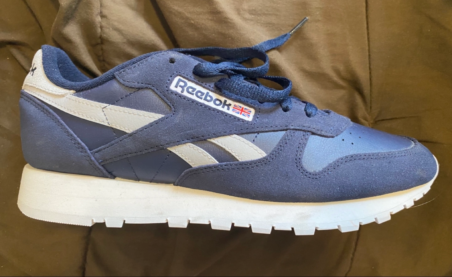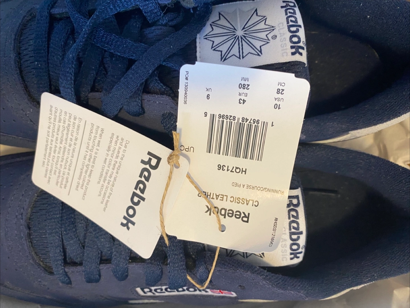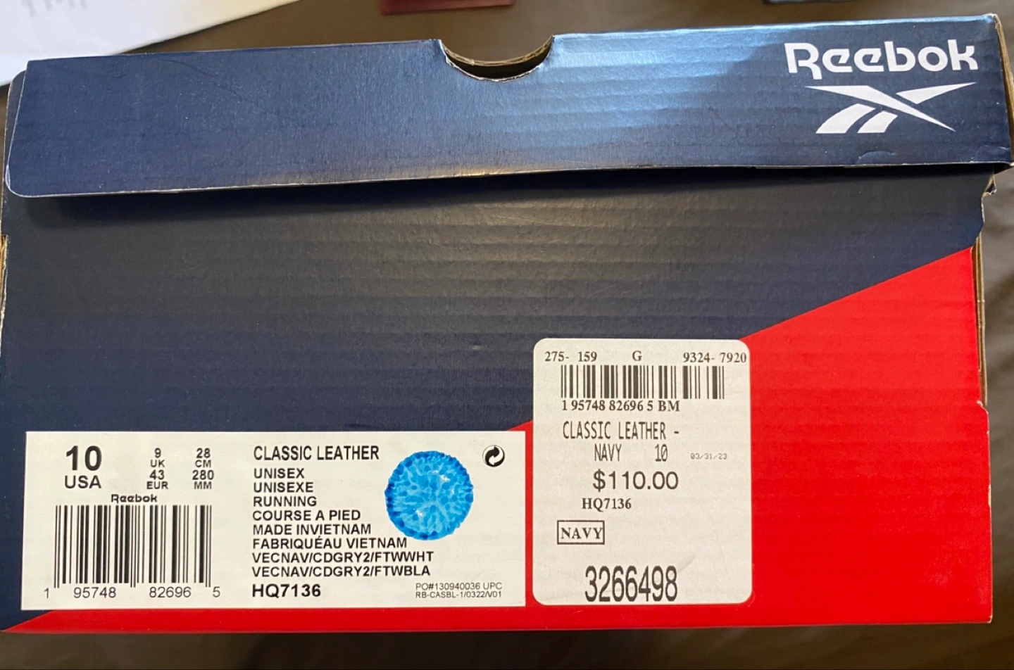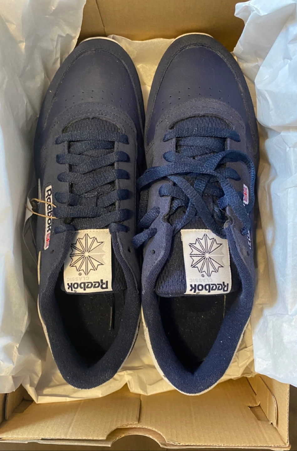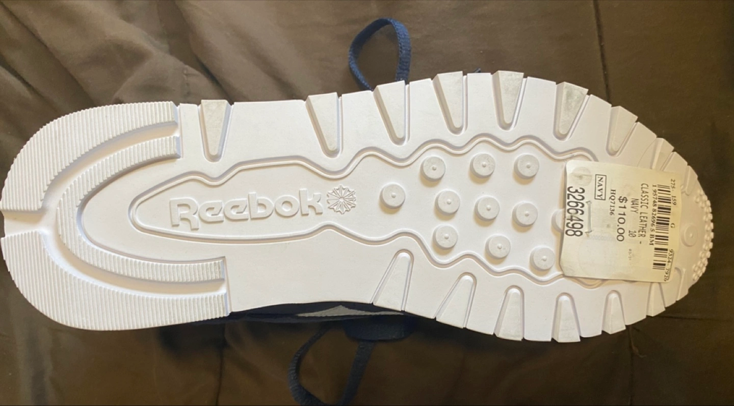 Selling a pair of Reebok Classic Leather sneakers in navy, size US 10! These are brand new and come with the original box. The box shows the original price was $110. They're a stylish and comfortable choice for everyday wear!