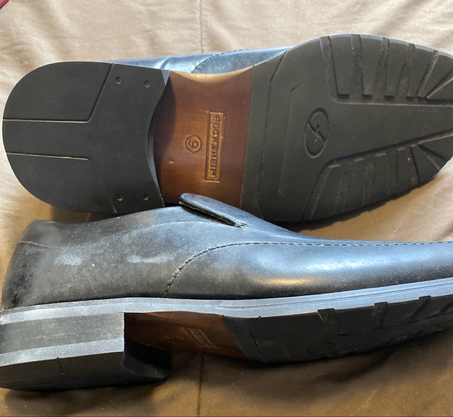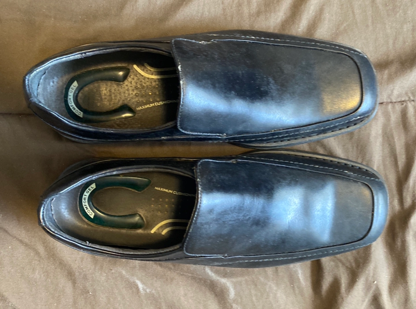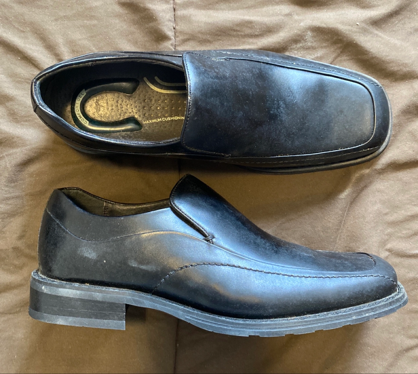 Selling a pair of Florsheim black leather loafers in size 9. They feature comfort gel insoles with maximum cushioning. The shoes come with their original box.