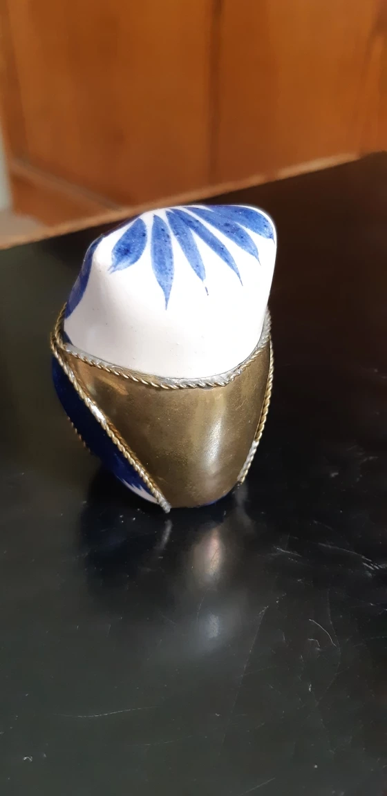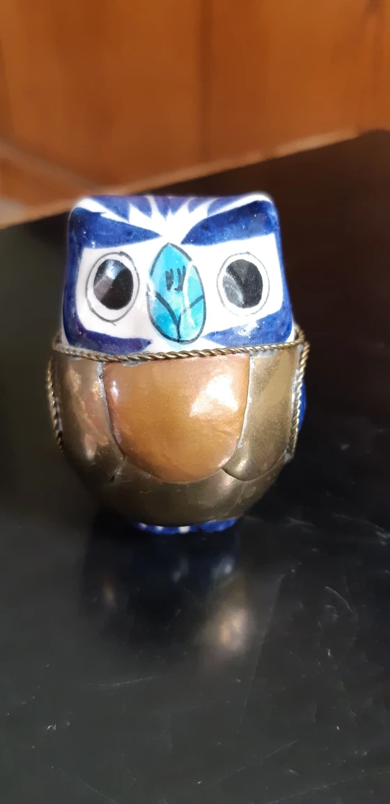 810Cute ceramic owl figurine with blue and white design and brass base In great condition Makes a lovely addition to any collection or decor!