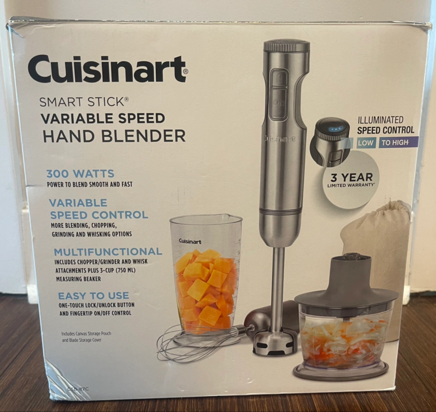 Selling a Cuisinart Smart Stick Variable Speed Hand Blender! It's brand new and comes with all the attachments. The blender is 300 watts, so it's powerful enough to blend smoothly and quickly. It also has variable speed control for more blending, chopping, and grinding options. Includes a chopper/grinder and whisk attachments plus a 3-cup (750 mL) measuring beaker. Easy to use with one-touch lock/unlock button and fingertip on/off control. Manual is included as well!