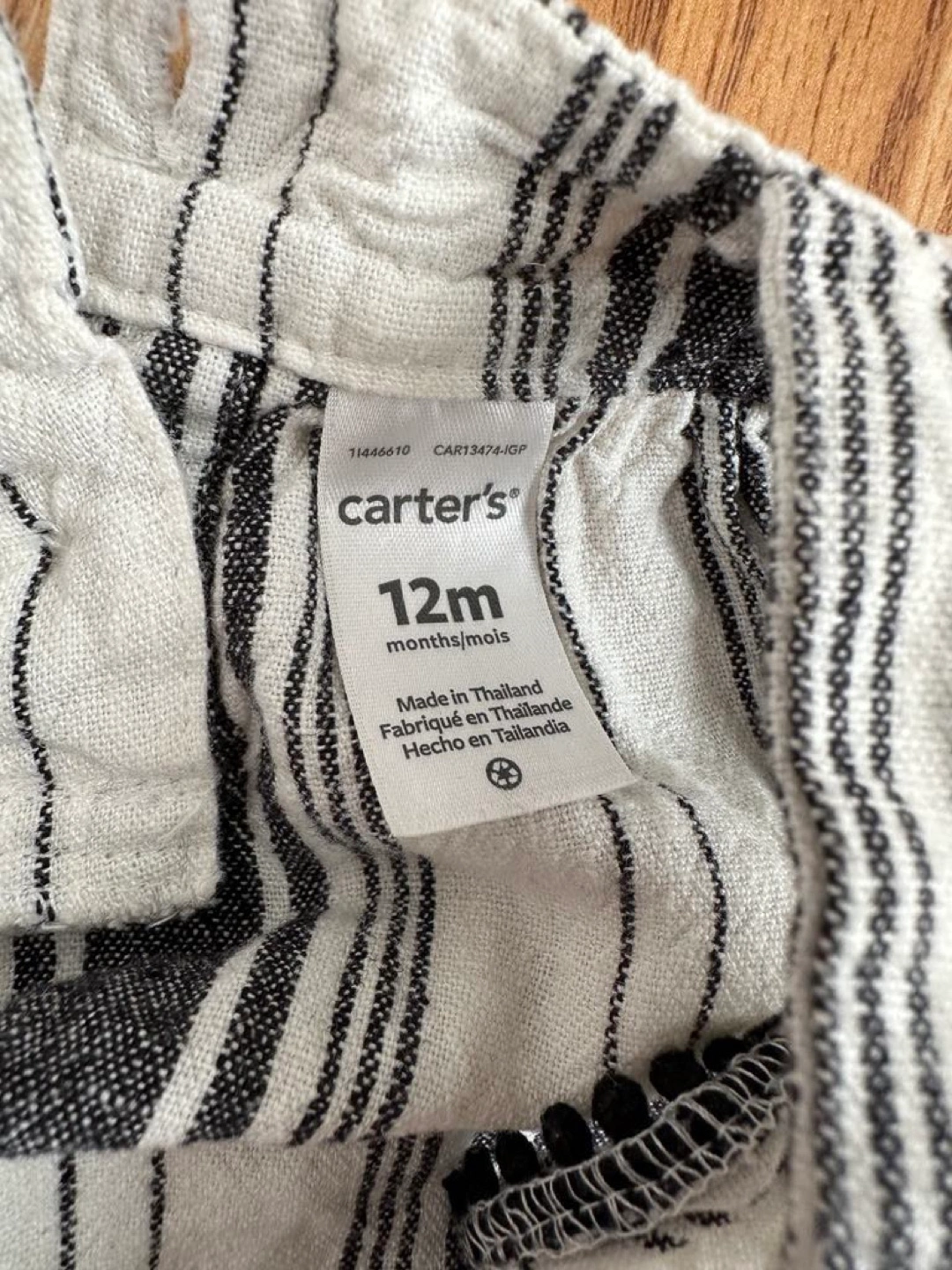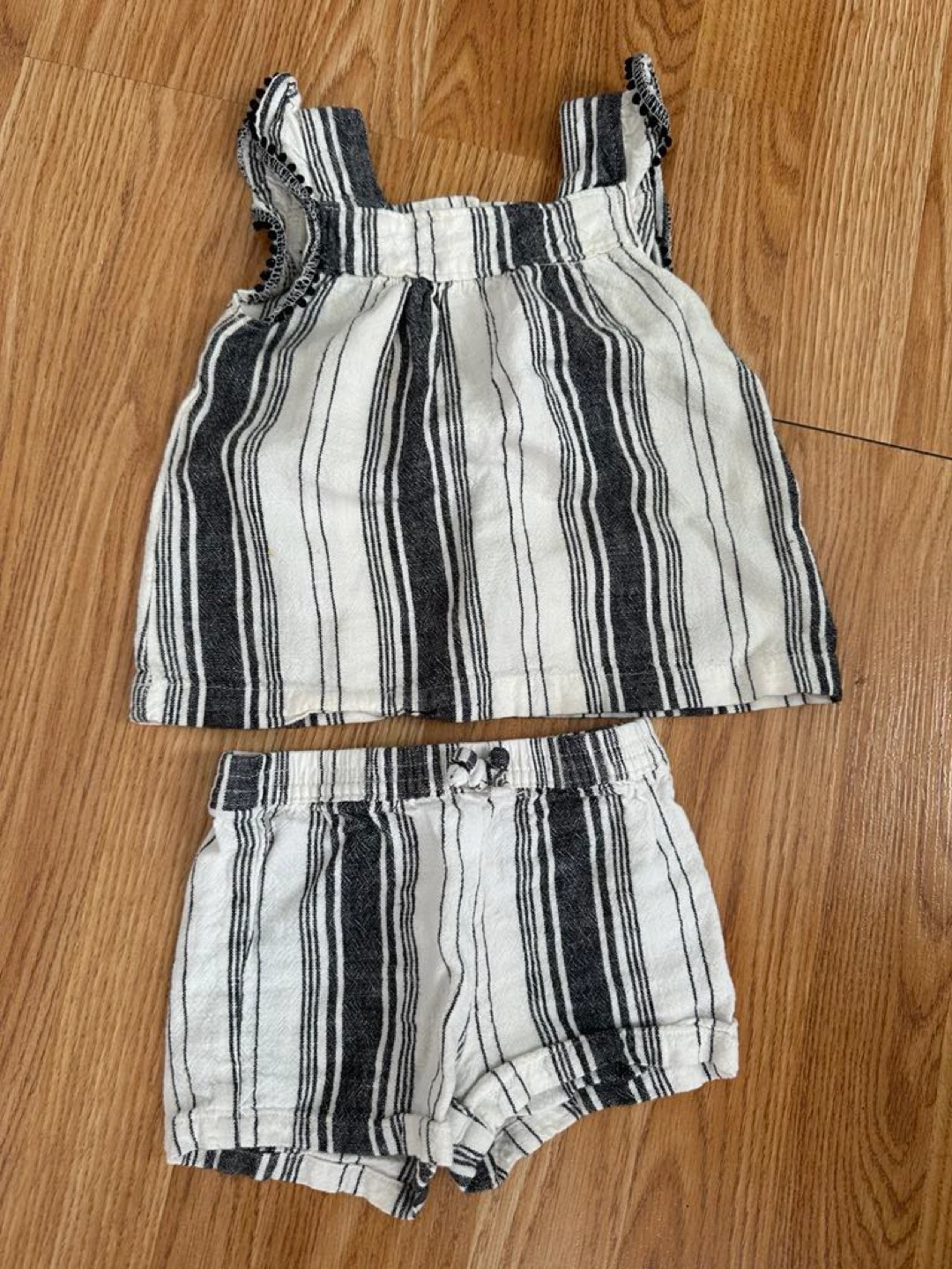 A cute Carter's outfit for your little one! This set is size 12 months and features a stylish dark grey blue and white striped design. Perfect for summer days!