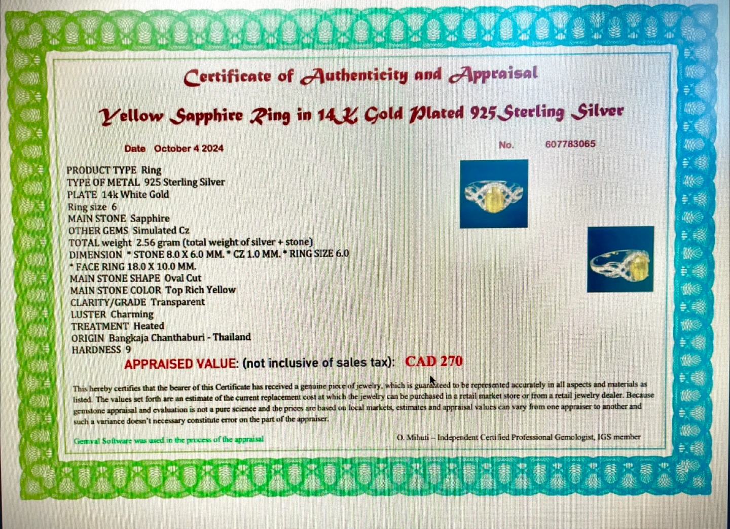 It features a main stone sapphire with simulated CZ and the main stone shape is oval cut. The appraisal value is CAD 270.