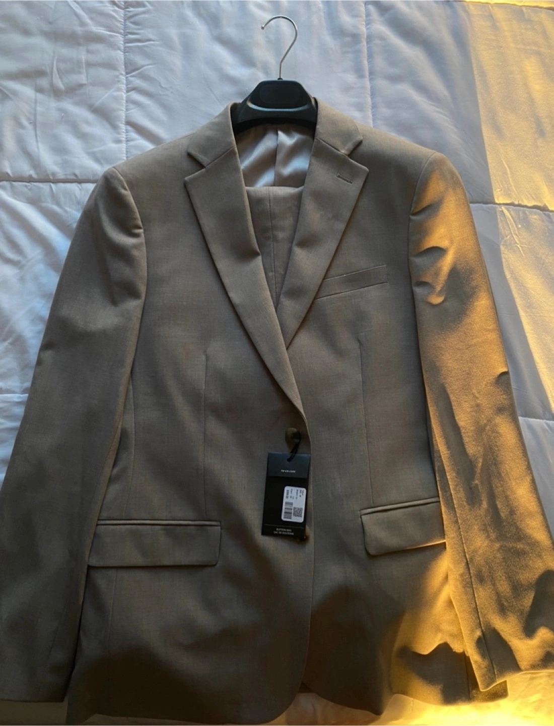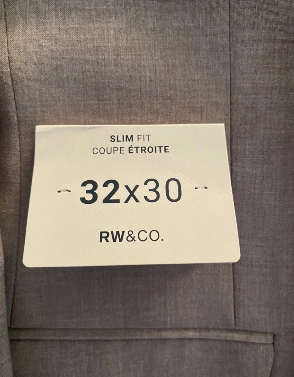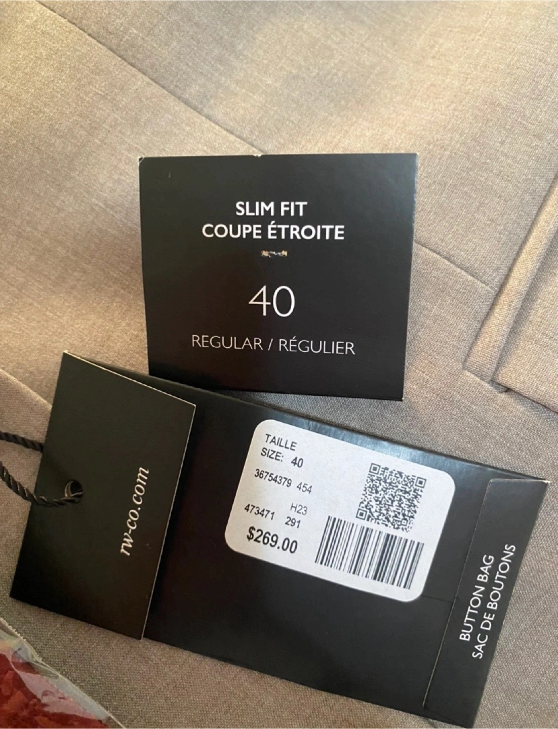 270RW & Co Slim-Fit Taupe Suit (Blazer and Pants) Comes with maroon tie & pocket square Size: Pants 32x30 Blazer Regular 40 Worn once 10/10 Conditon https://www.rw-co.com/en/slim-fit-taupe-suit-blazer/473471.html?utm_source=instore-qrcode&utm_campaign=instore-qrcode-products&utm_medium=referral