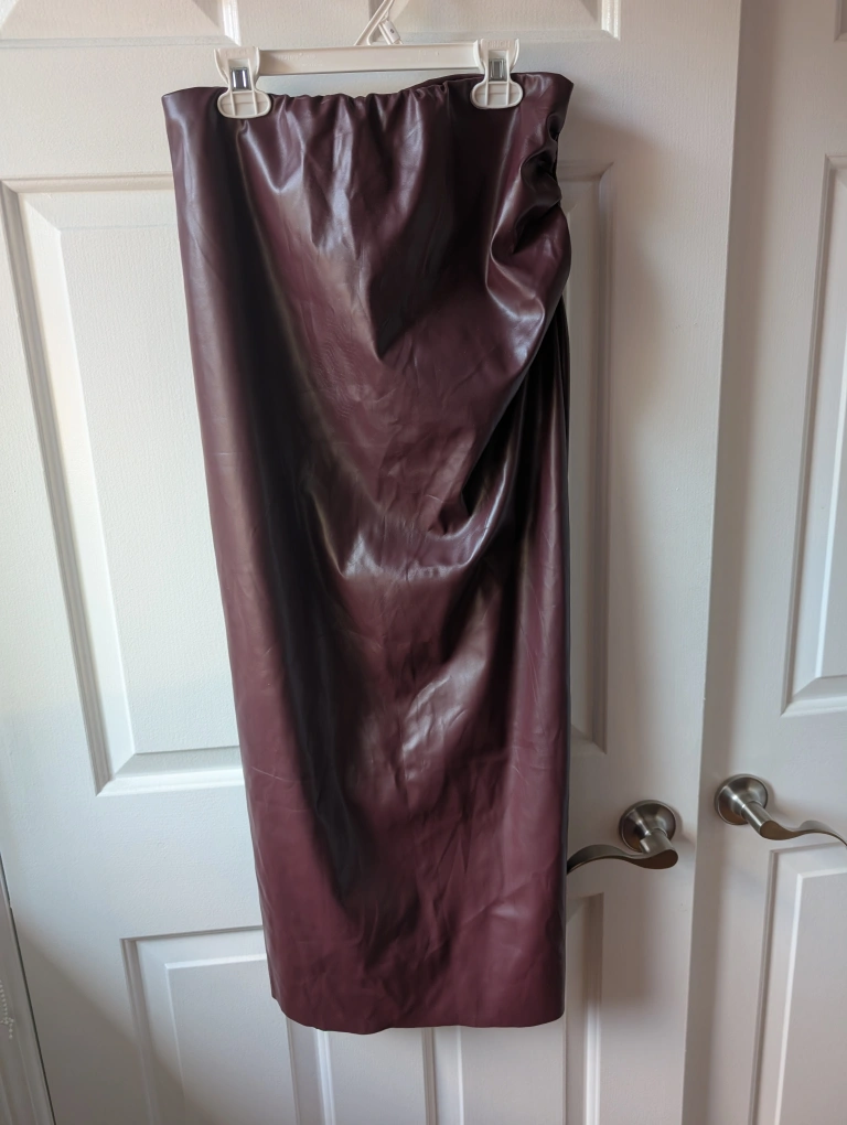 Selling a Shein faux leather skirt in a lovely burgundy colour! It's a size large. Perfect for adding a bit of edge to your wardrobe
