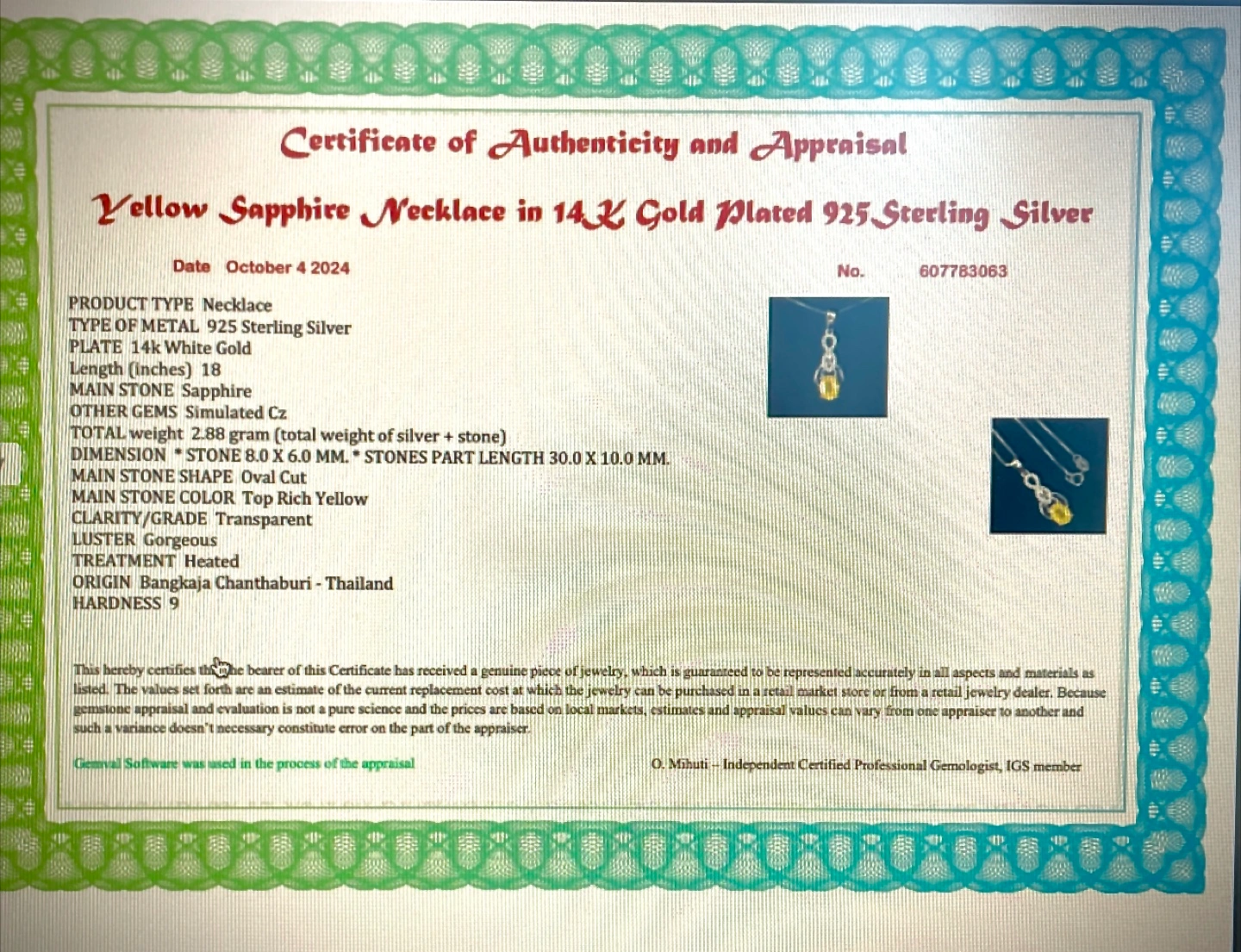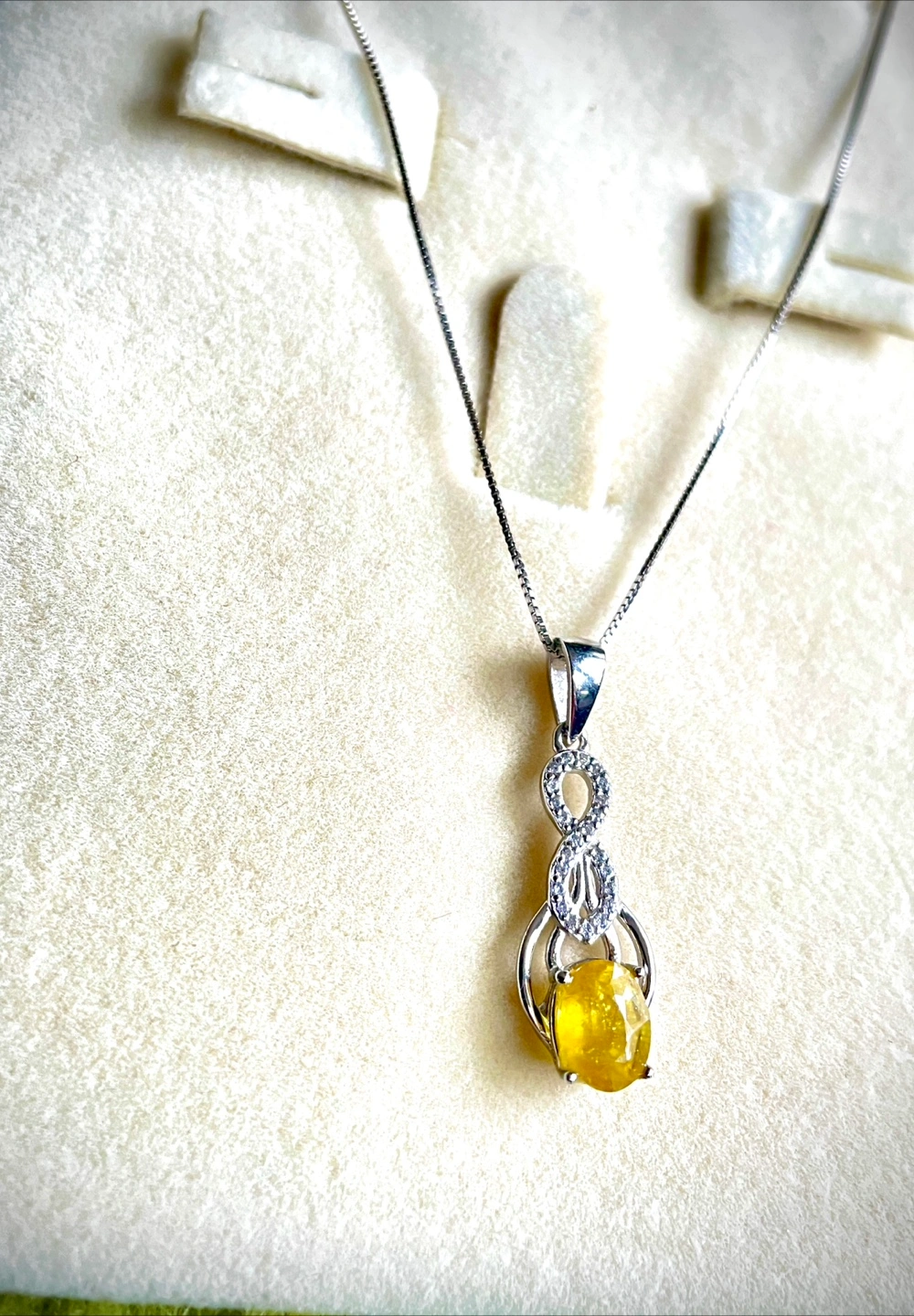 In Jewelry a beautiful yellow sapphire necklace. It's made of 925 sterling silver stamped,with a 14k white gold plate. The main stone is an oval-cut top rich yellow sapphire,other stone are simulated Cz.