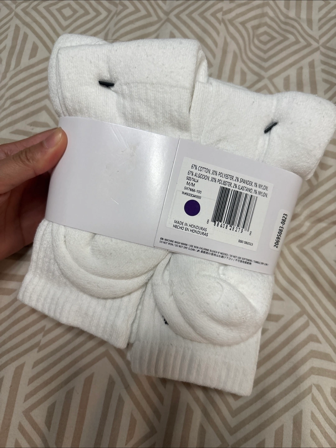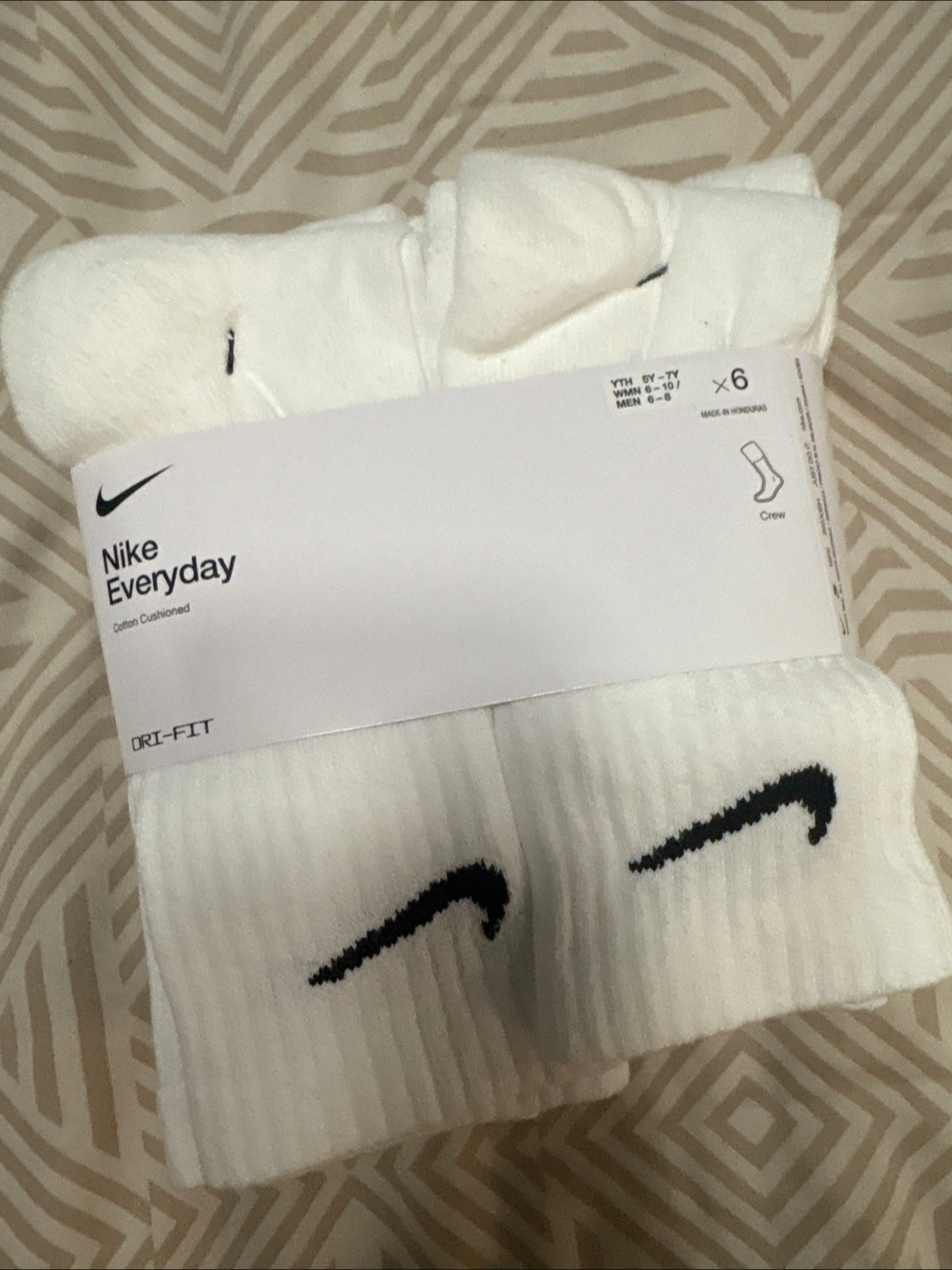 Here's a pack of Nike Everyday cotton cushioned crew socks! They're white, and the youth size fits sizes 6Y-7Y/ Women’s sizes 6-10, or Men's 6-8.