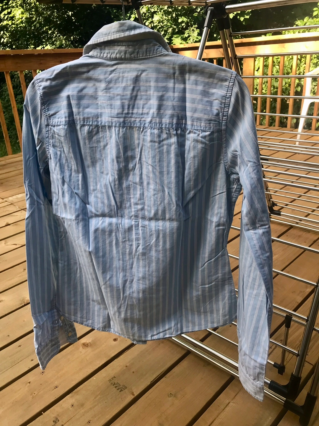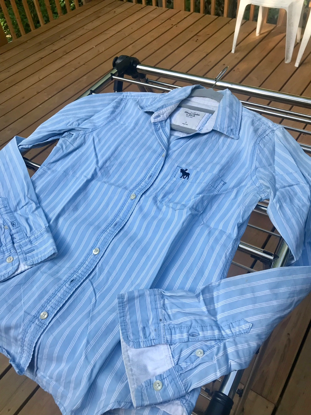 I'm selling an Abercrombie & Fitch button-up shirt in size small. It's a light blue colour with white stripes and has the Abercrombie logo on the pocket. Perfect for a casual look!