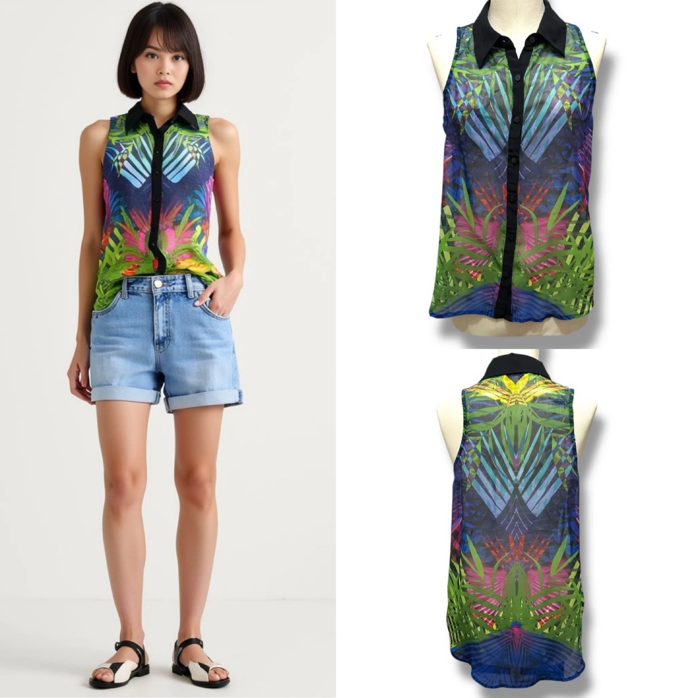 • Brand: Decree • Size: M (Medium) • Condition: Excellent – no visible flaws or signs of wear • Material: 100% Polyester – lightweight, semi-sheer, and breathable • Design: Tropical print with symmetrical palm leaf motif in vibrant blues, greens, and purples • Style: Sleeveless, collared blouse with full button front • Fit: Relaxed with high-low hem for a flattering silhouette • Condition: Excellent – no visible flaws or signs of wear • Made in: Indonesia