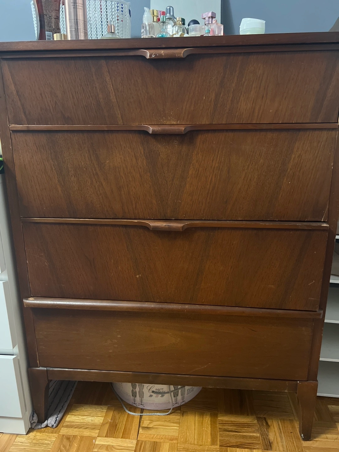 Here's a lovely wooden dresser with four drawers! It's a great piece for adding some storage to your bedroom or any room in your home. It's in good condition and ready for a new home!