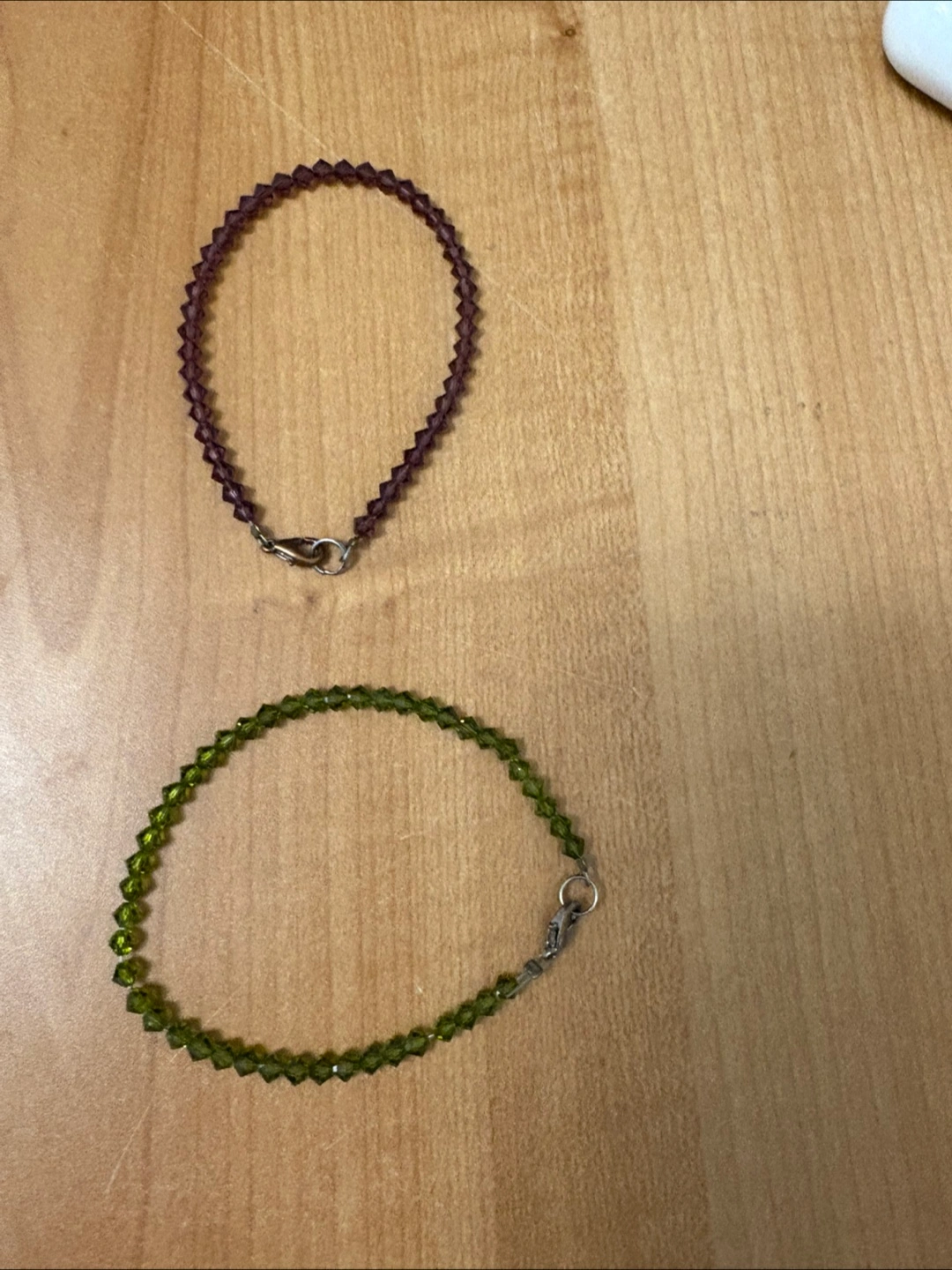 Made out of Swarovski beads, purchase from farmers market. Clasp is a bit tarnished from sitting in storage! Green bracelet is a bit bigger than purple one.