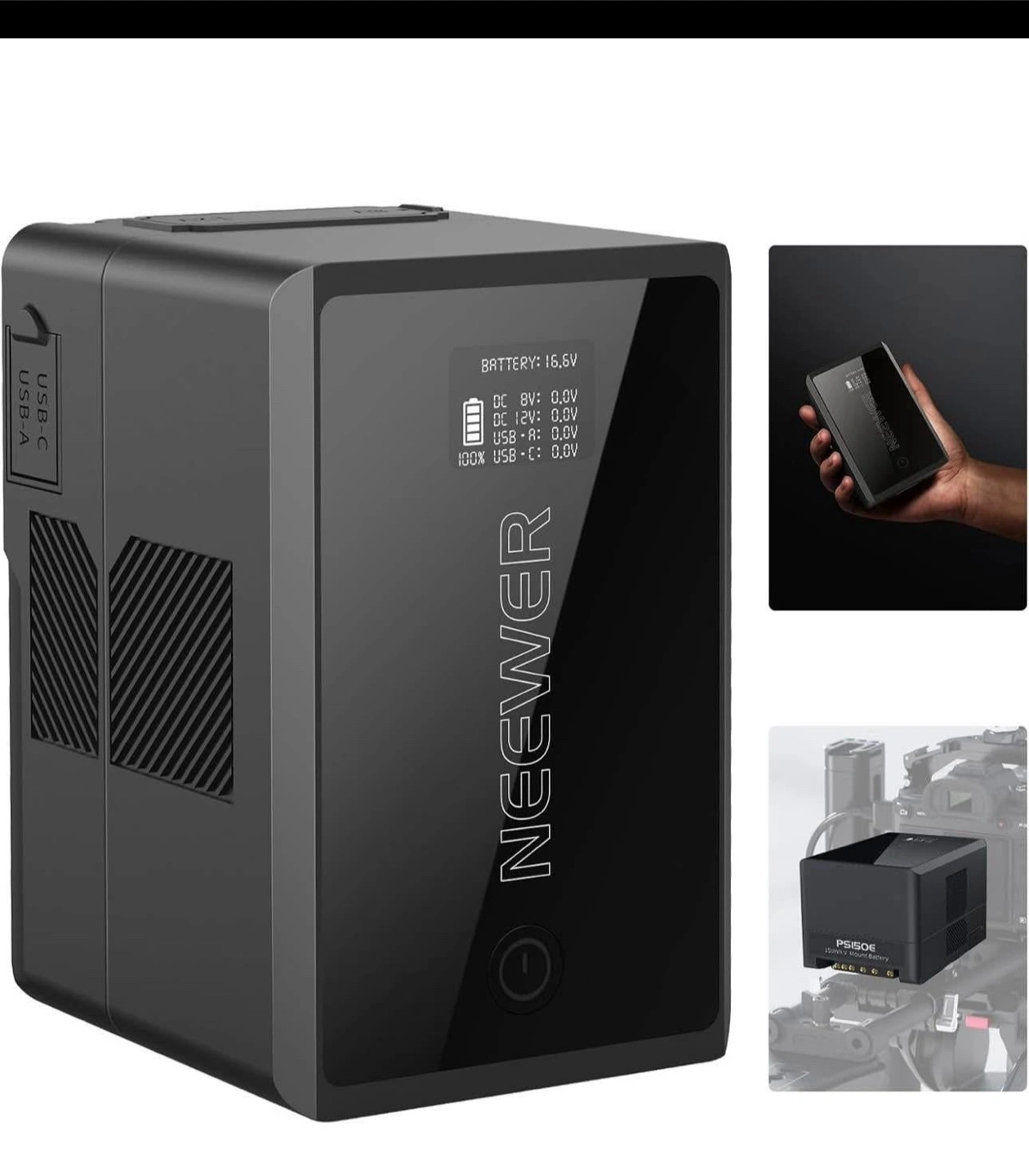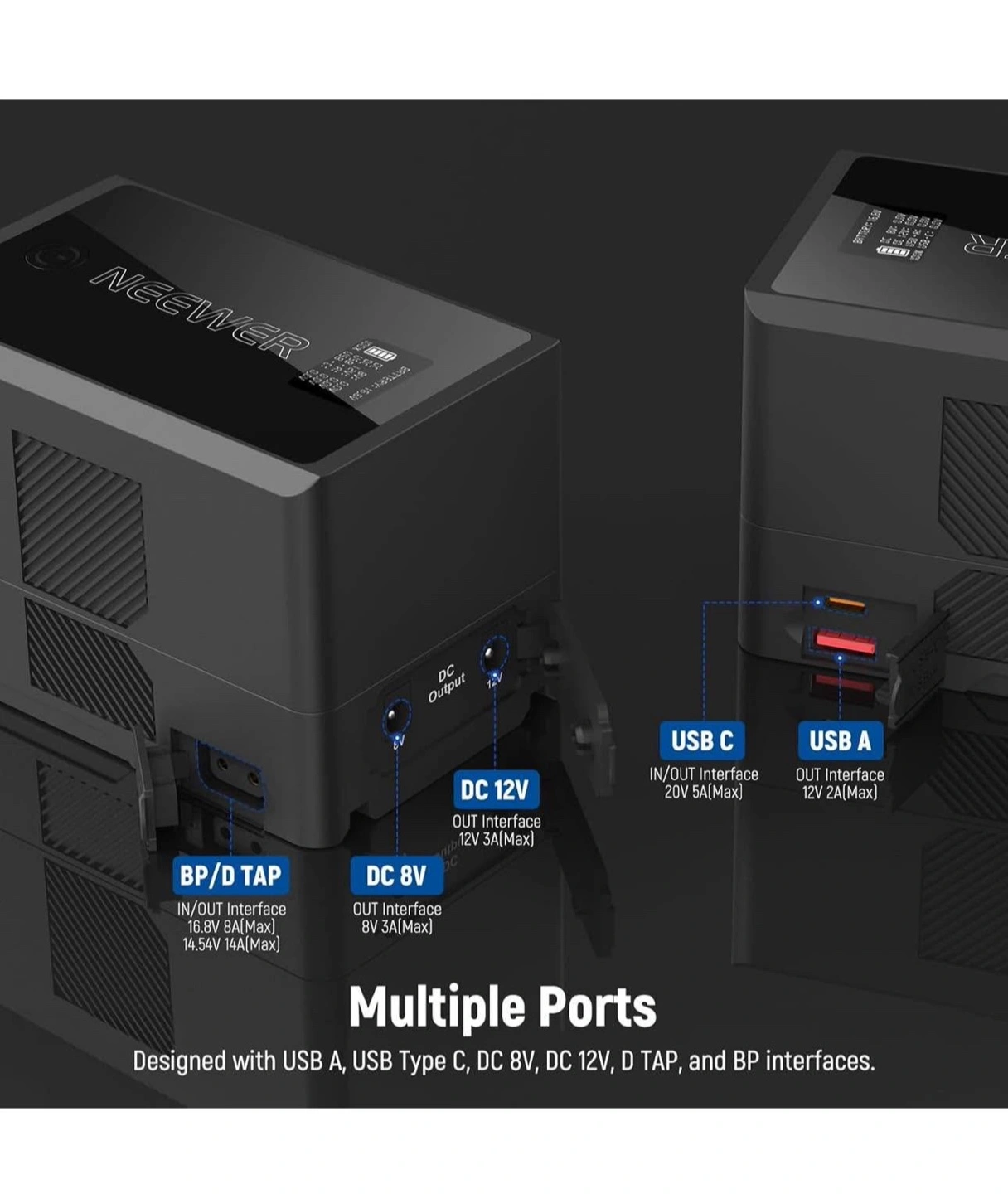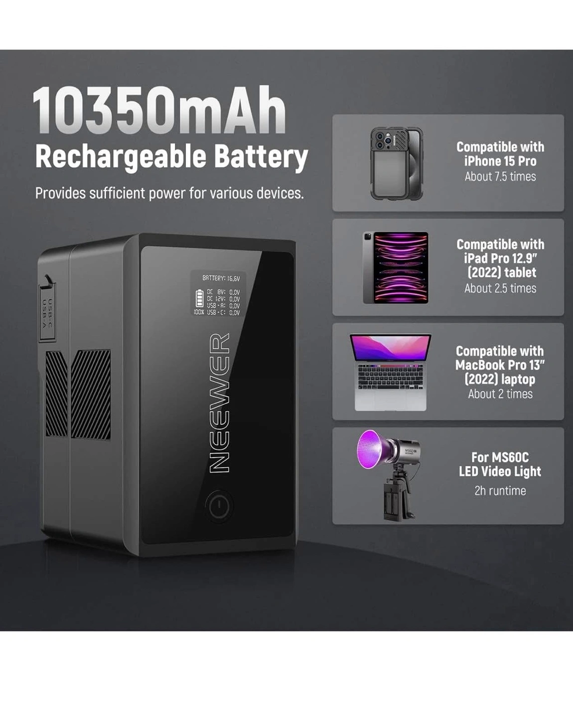 Selling a Neewer rechargeable battery with 10350mAh capacity. It provides sufficient power for various devices. It's compatible with a wide range of devices, including smartphones, tablets, and laptops. Designed with USB A, USB Type C, DC 8V, DC 12V, D TAP, and BP interfaces for multiple ports.