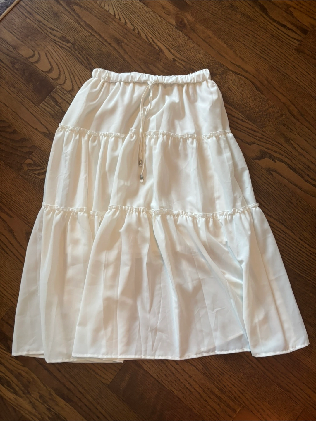 Selling a cute maxi white tiered skirt! It's in great condition and would be perfect for summer. The skirt has a drawstring waist for a comfortable fit!