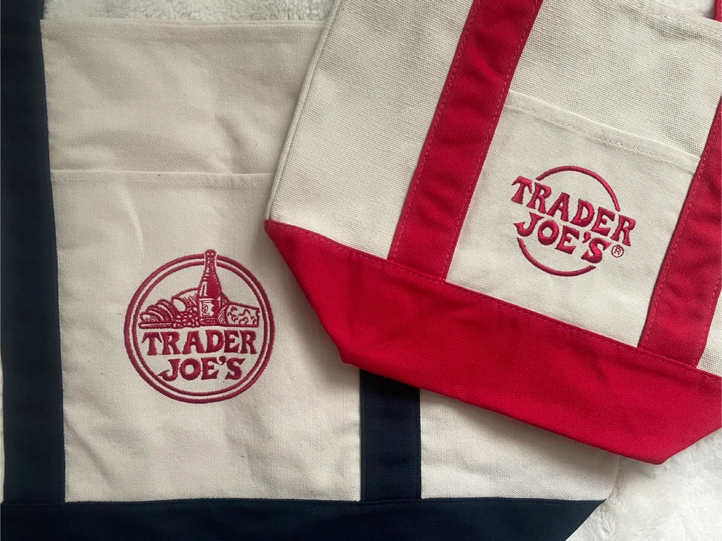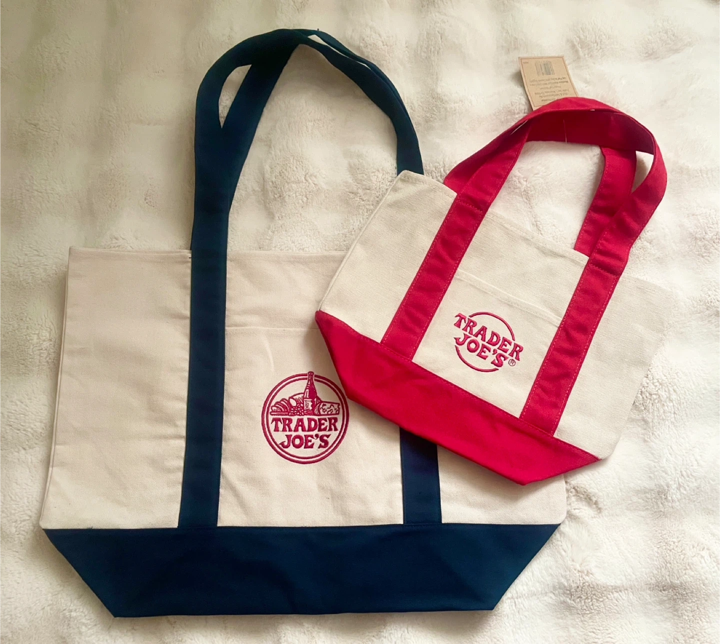 Brand new two Trader Joe's canvas tote bags, one large and one small. Both bags feature the iconic Trader Joe's logo embroidered on the front. They're made of durable canvas material with sturdy handles.