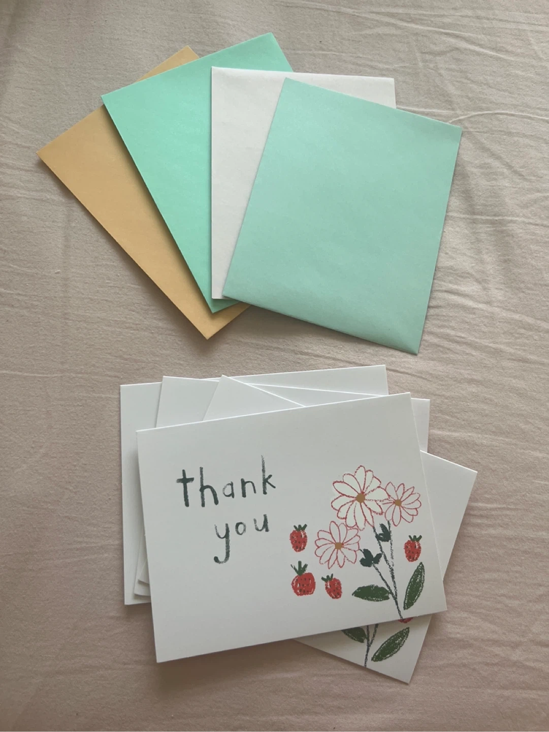 4 'Thank You' cards, perfect for adding a personal touch to your messages! The cards feature a cute floral and strawberry design. Included are matching envelopes in a variety of colours. You can choose which colours you want as I have multiple envelopes of the same colours.