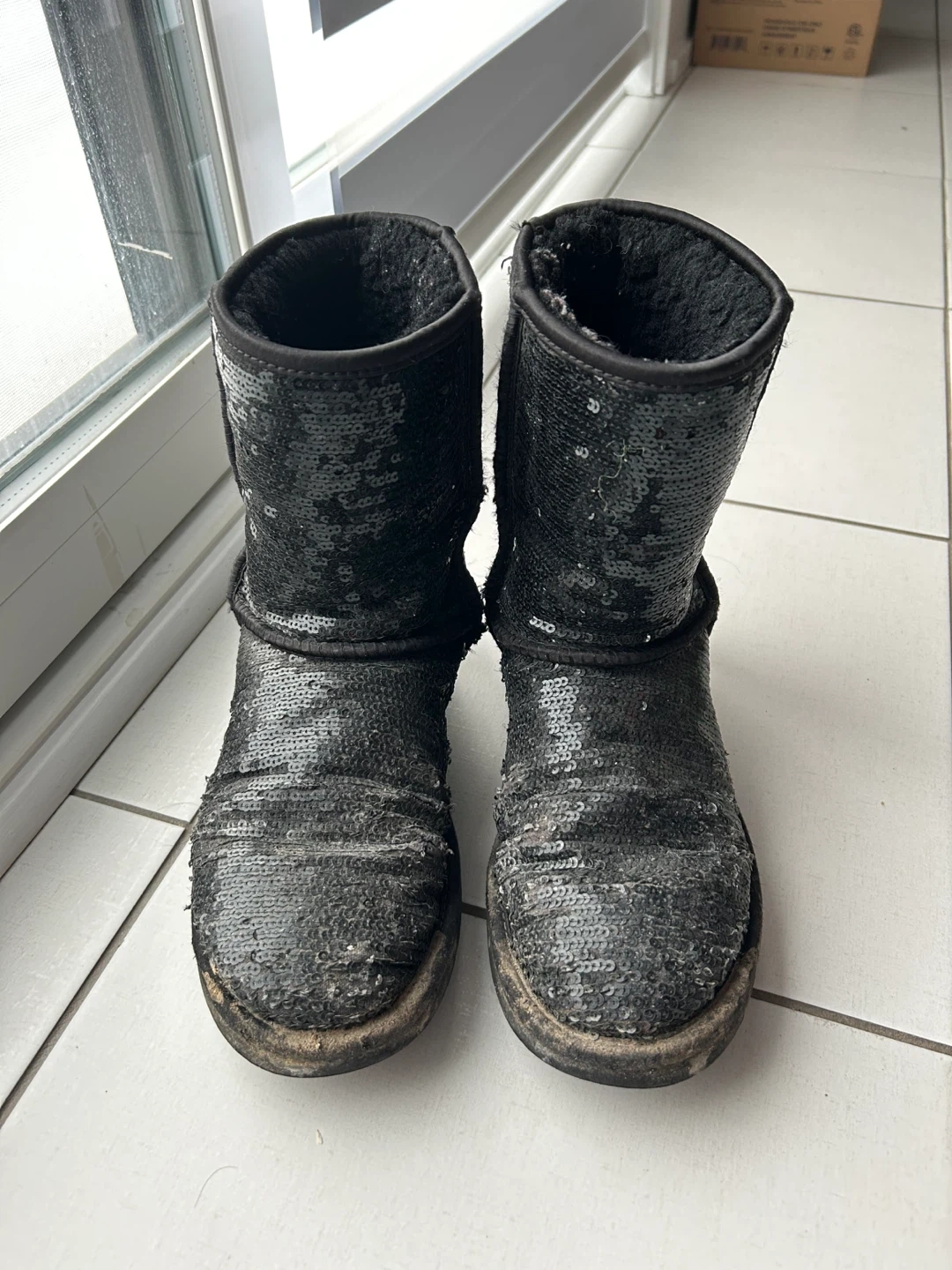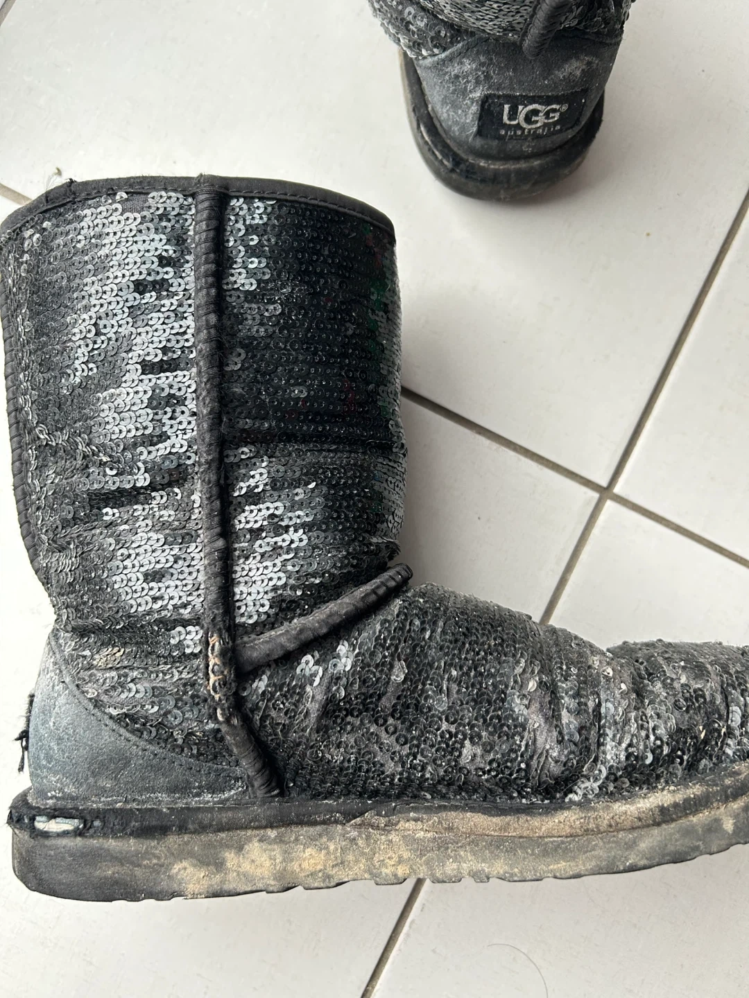These are used women’s Ugg boots with black sequins, women's size 8.