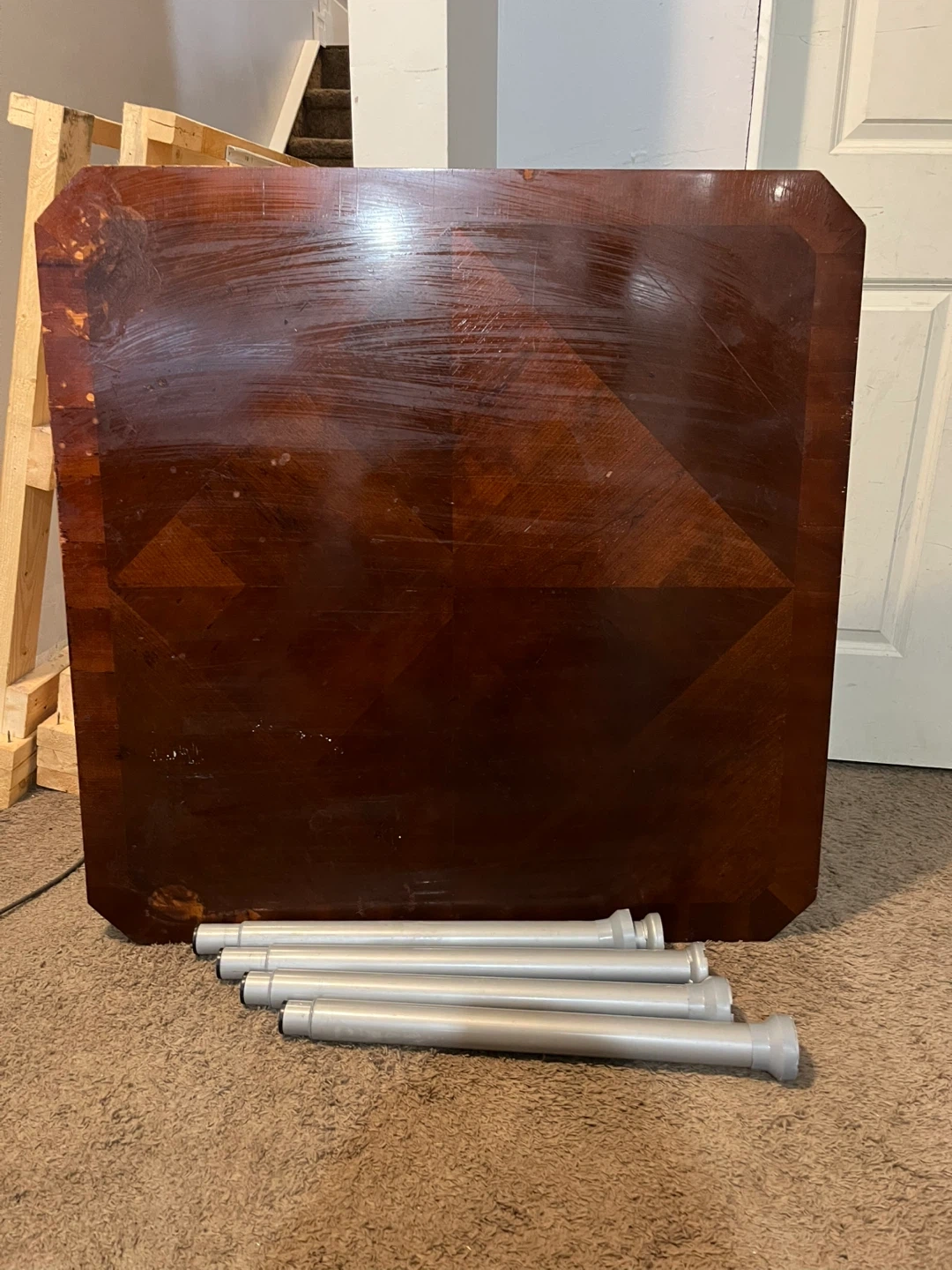 This is a wooden table top with a rich, dark wood finish. It features an octagonal shape with an inlaid geometric pattern. Comes with four detachable silver metal legs. Some scuffs on the surface could probably use refinishing.