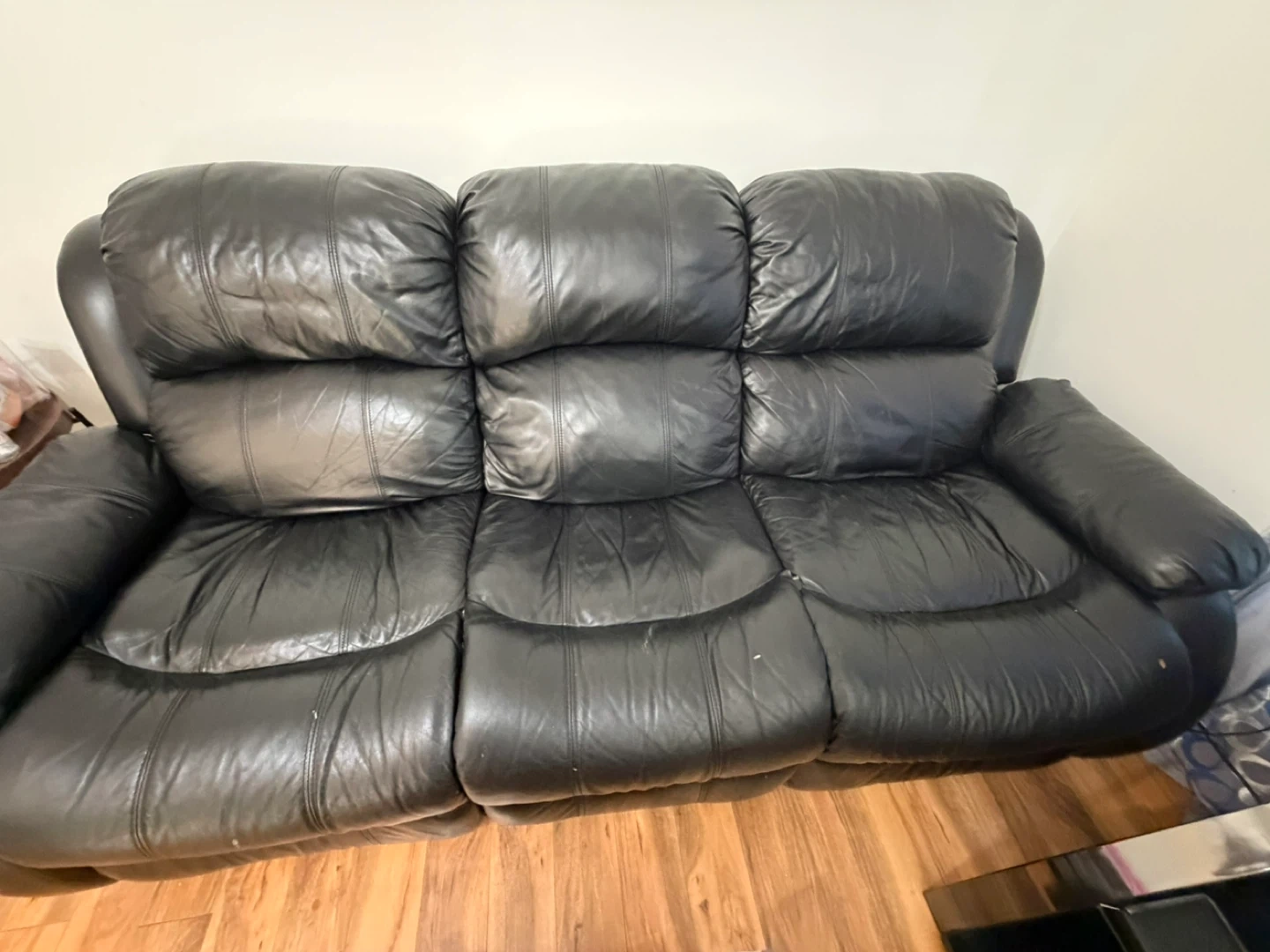 Black leather reclining sofa, seats three. Plush cushions for comfort. Perfect for a living room or family room! Moving out sale