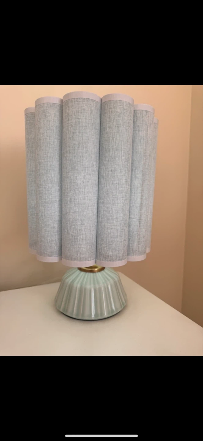 Cute table lamp with a pastel blue ceramic base and a light blue pleated fabric shade. It's a nice accent piece for a bedroom or living room.