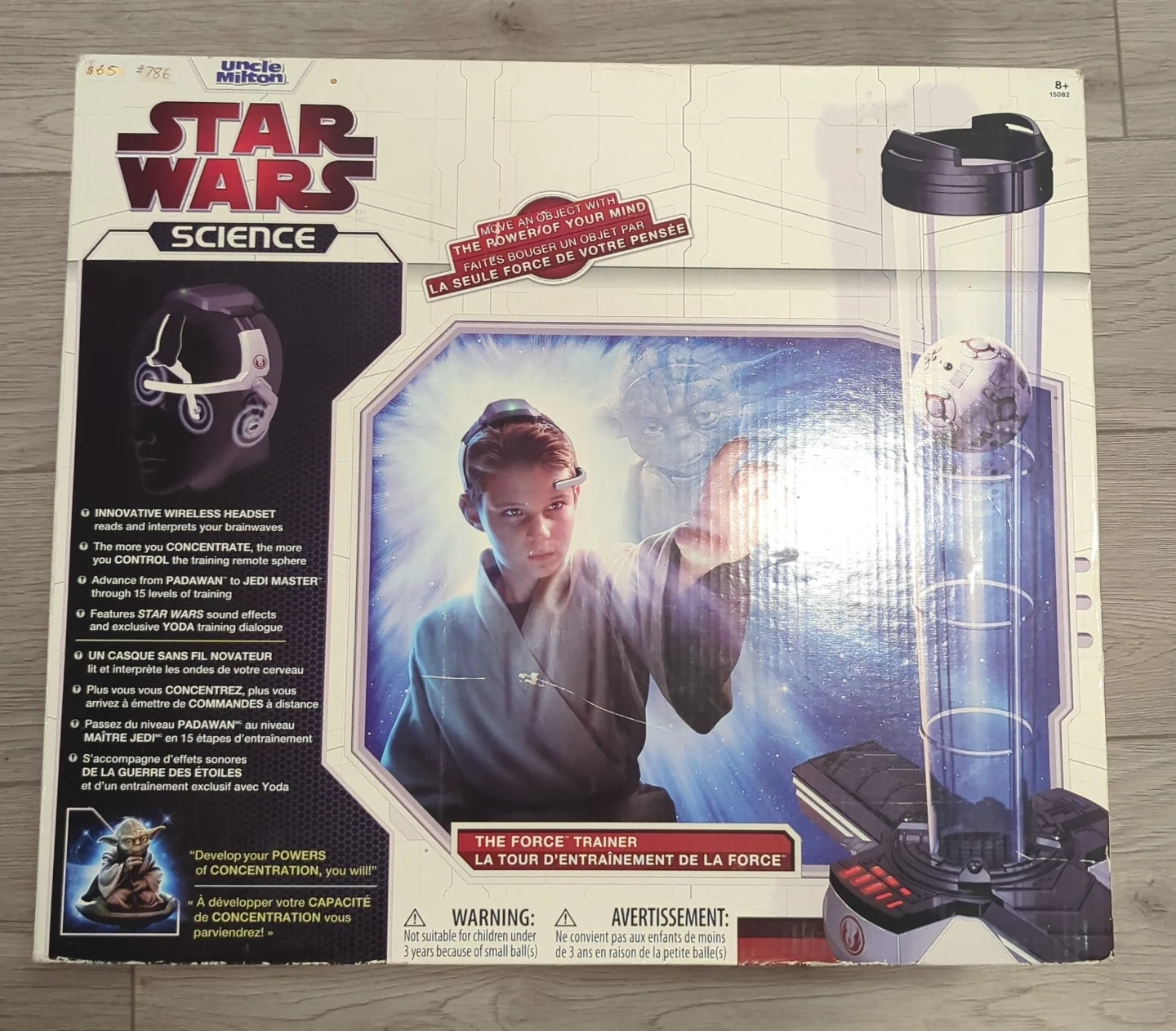 This is the Uncle Milton Star Wars Science The Force Trainer. New in box, never used. It features an innovative wireless headset that reads and interprets brainwaves. Advance from Padawan to Jedi Master through 15 levels of training with Star Wars sound effects and exclusive Yoda dialogue.