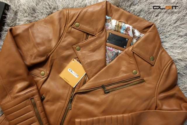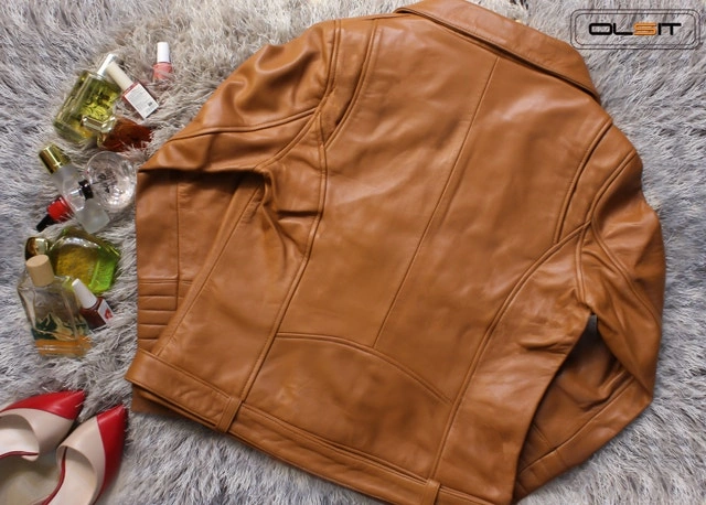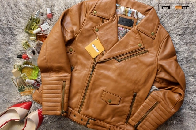 Skinny fit, lined with patterned premium silk. Features a seam-sealed YKK zipper and bronze buttons. Color: Almond Brown. Size: Small. See attached size chart for details. Made from calfskin leather. Care instructions: Wipe or spot clean only. Use leather conditioner to keep moisturized. Dry clean for difficult stains only. Condition: New. For Sale By: Owner. Curbside pick up available. Drop off/Delivery available. Cash accepted.