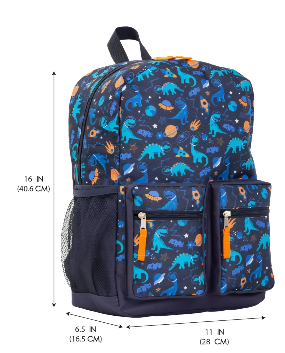 This navy backpack features a fun all-over print of dinosaurs in space, complete with planets and rockets. It's 16 inches tall, 11 inches wide, and 6.5 inches deep. It has multiple zippered pockets and mesh side pockets for water bottles. Roar-some for school adventures!
