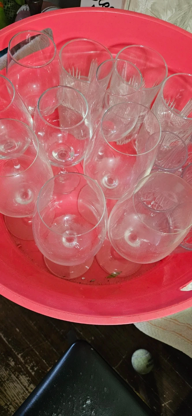 A collection of clear glass drinkware, including wine glasses and tumblers. Various styles and sizes are present. Great for hosting or everyday use!