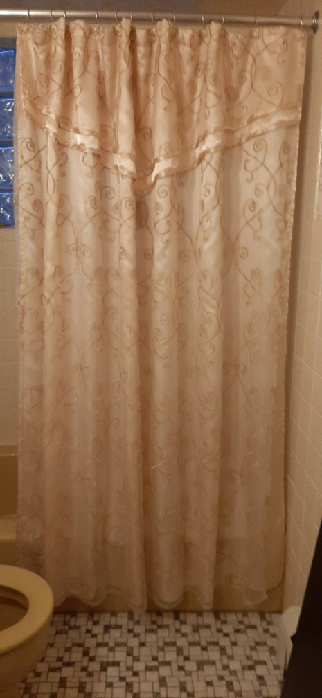 Selling a beige shower curtain with a delicate swirl design! It adds a touch of elegance to any bathroom. In good condition, ready to use