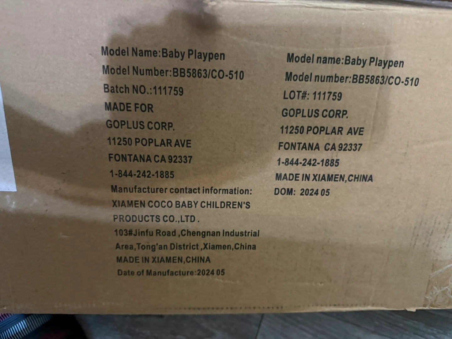 Buy & SellGoplus Baby Playpen - Model BB5863/CO-510Goplus Baby Playpen - Model BB5863/CO-510$50Selling a baby playpen by Goplus! The model number is BB5863/CO-510. The date of manufacture is 2024 May. It is made in Xiamen, China.ConditionNewWHERE TO MEETCheck LocationView MapSELLERverifiedYounasWexford984 reviews0 chats·0 favorites·11 viewsSEND CHAT TO SELLERHi Younas! I’m interested in your listing.Hi Younas! I’m interested in your listing.Get the Karrot app to chatSign In to chat
