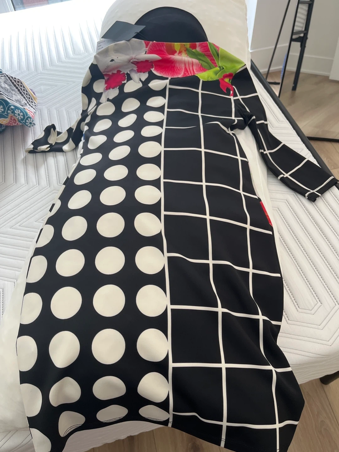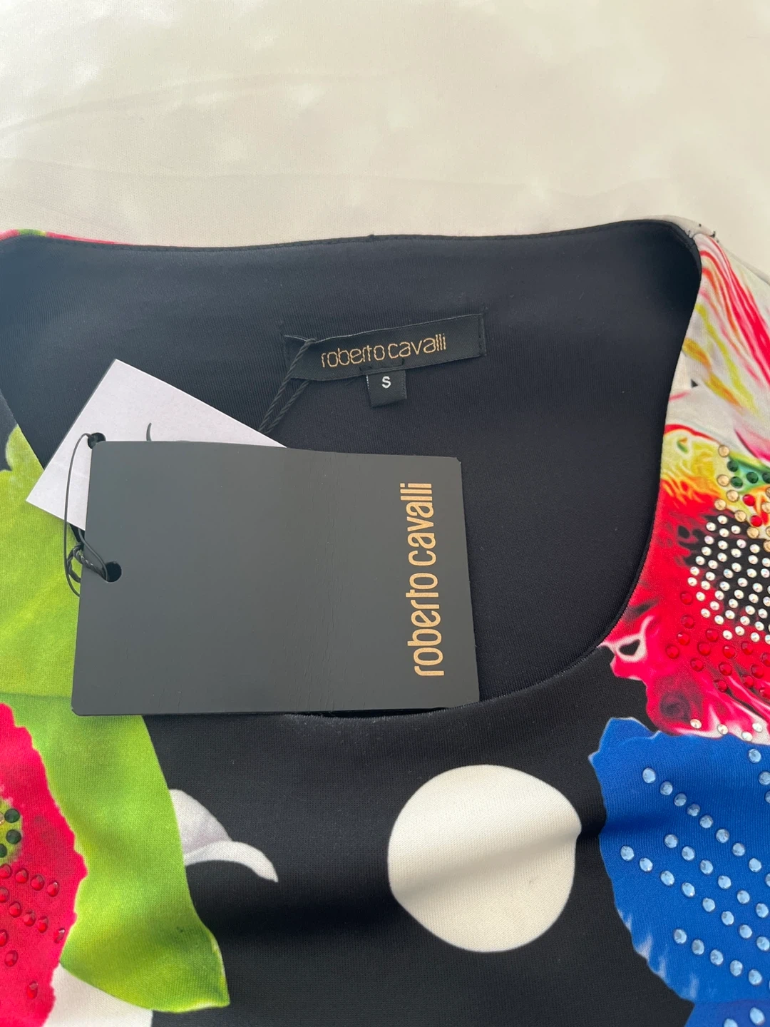 This Roberto Cavalli dress features a vibrant floral print mixed with a classic polka dot pattern. It has long sleeves and a flattering silhouette. Size is S.