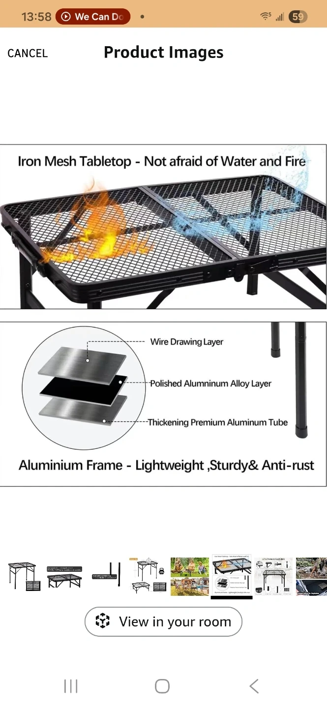 This ALZEROOE folding table features an iron mesh tabletop that's water and fire resistant. It has an aluminum frame that's sturdy and anti-rust. The table's compact folding size makes it easy to store and transport. Its weight capacity is 73lbs/33kg, and it weighs only 2.1kg/4.6lbs.