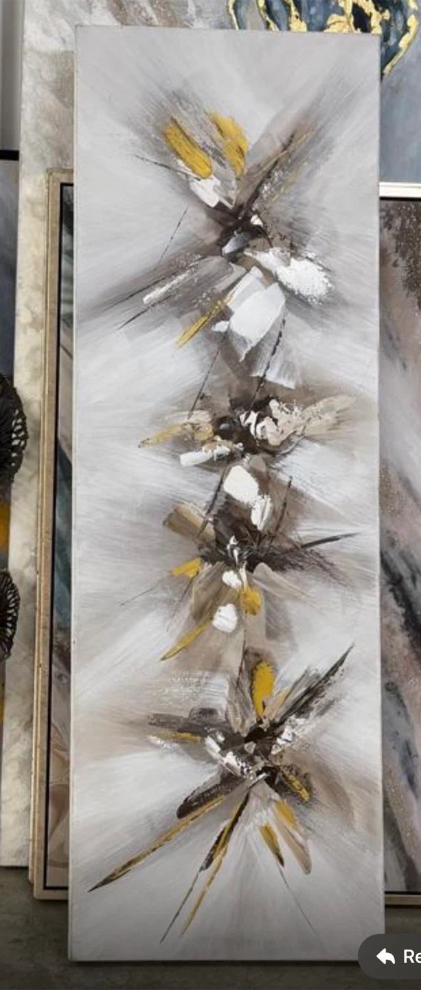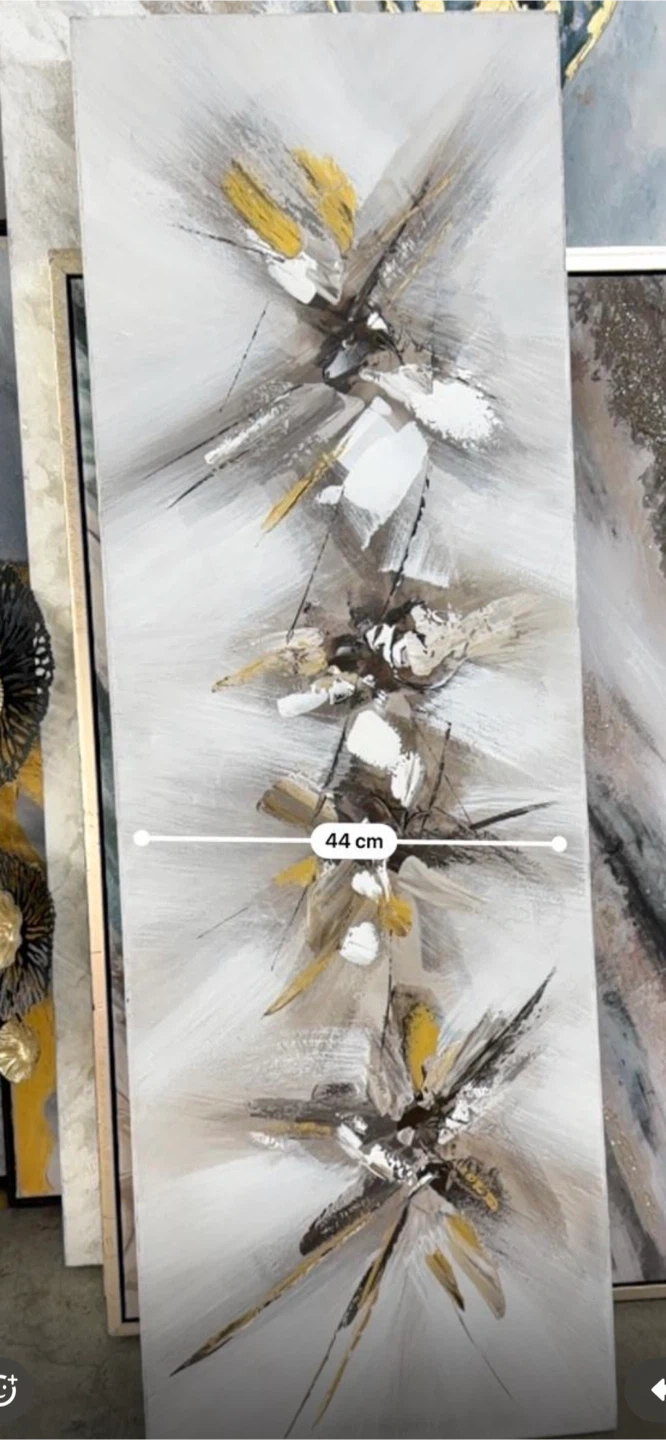 Modern abstract canvas painting. It's 44 cm wide and 1.47 m tall. Gold, white, and grey tones. Adds a sophisticated touch to any room.