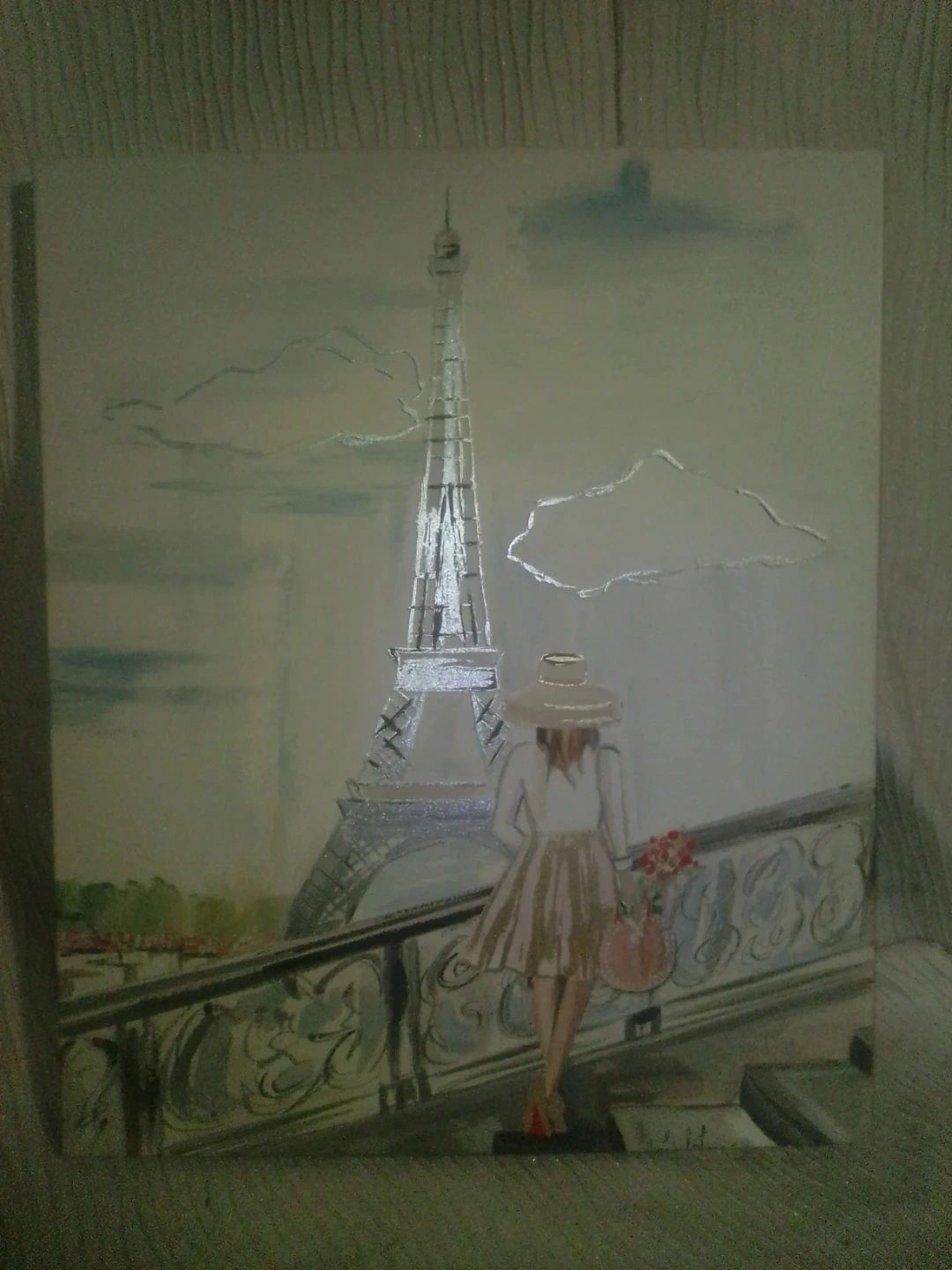 Canvas print featuring a woman in a hat with flowers, looking at the Eiffel Tower. Art is stretched on a wooden frame. Ready to hang.