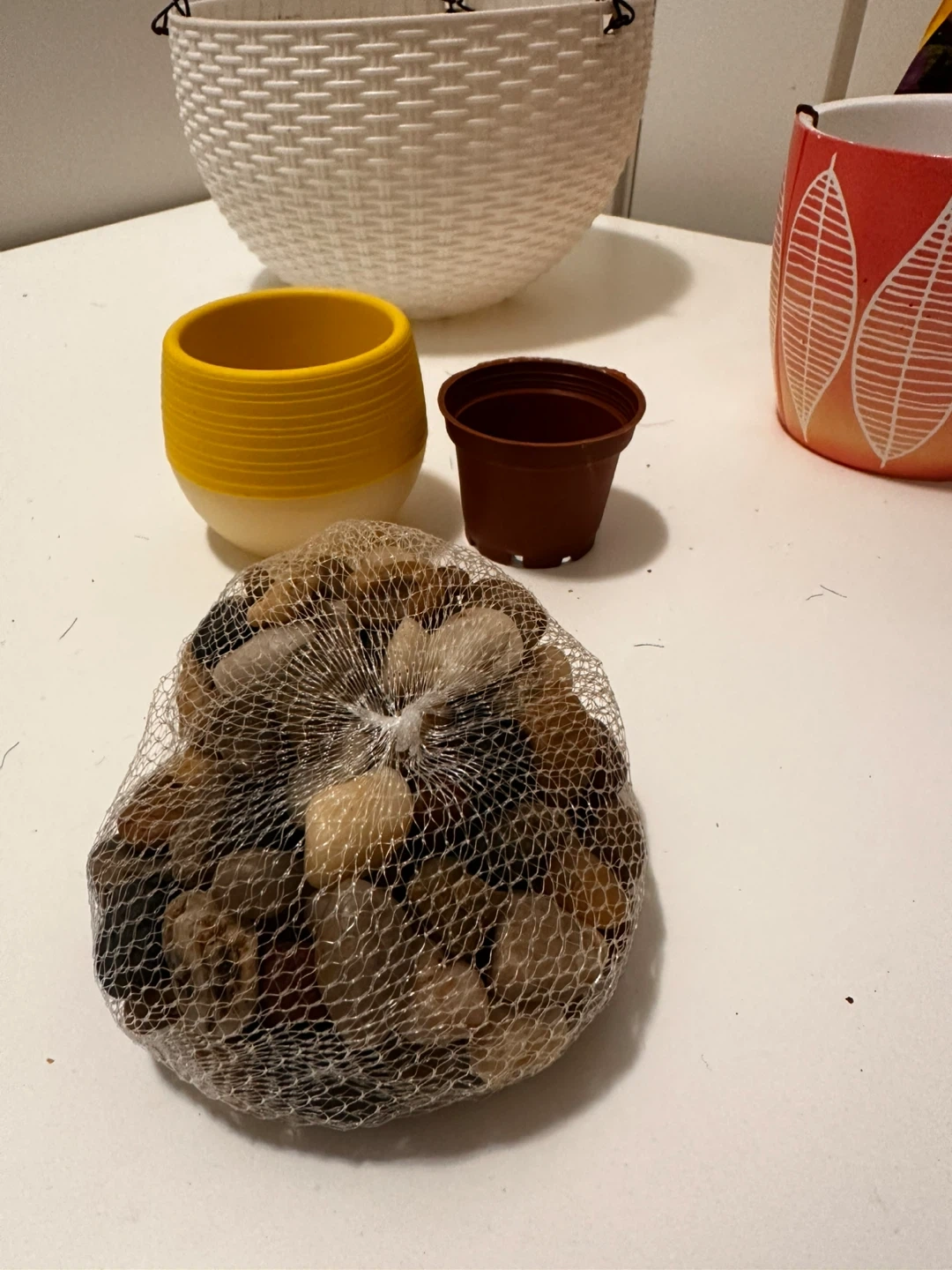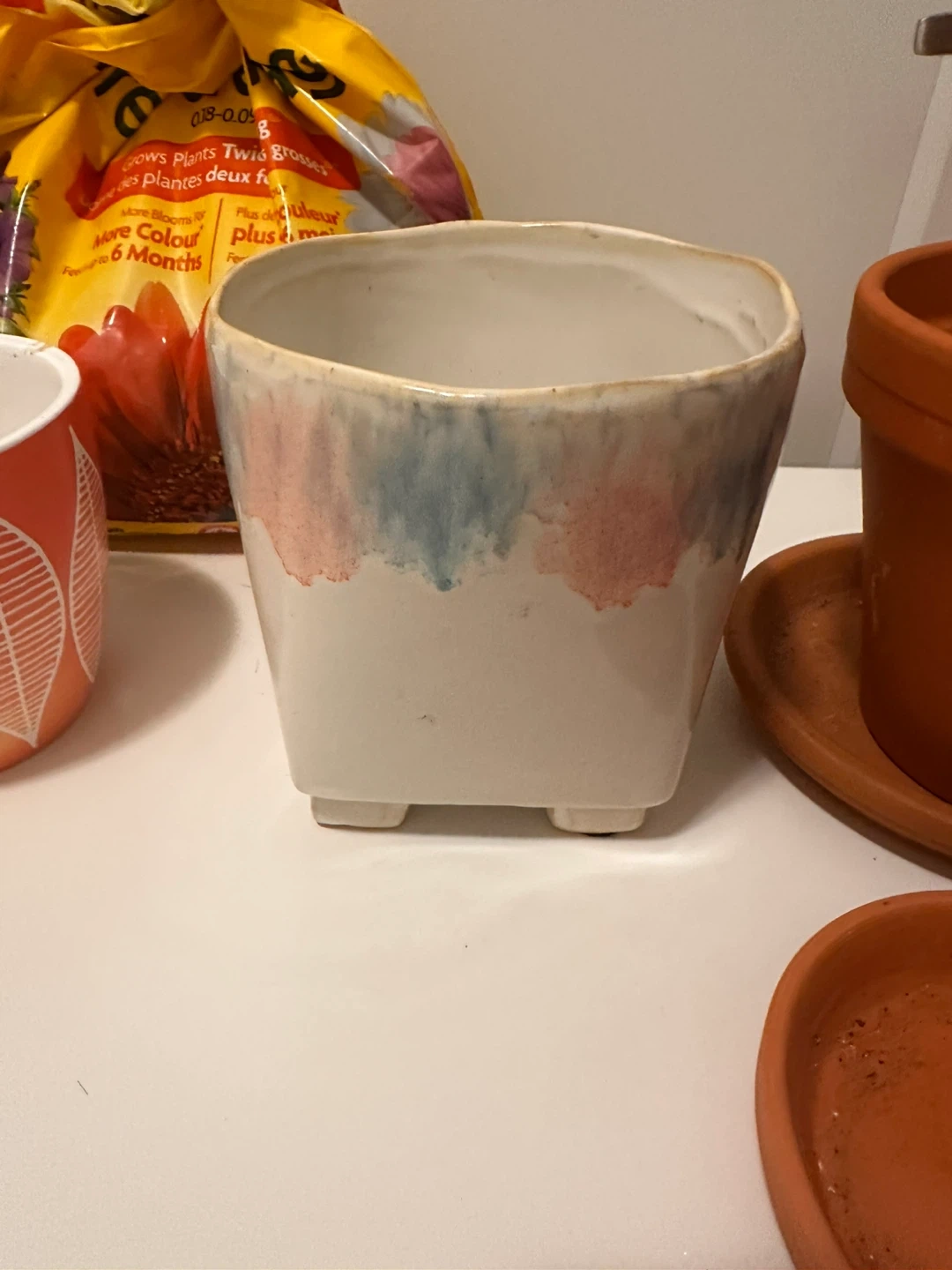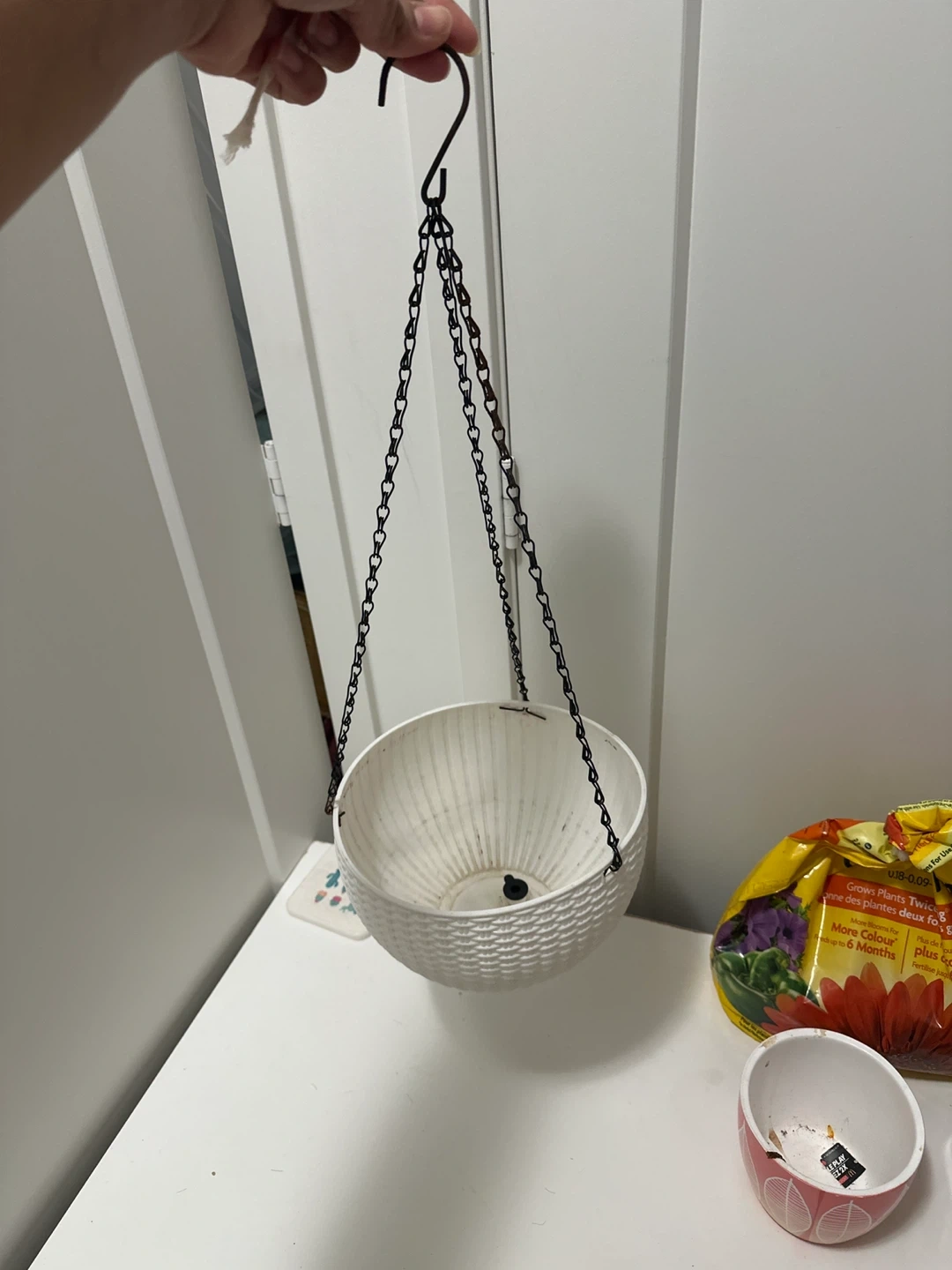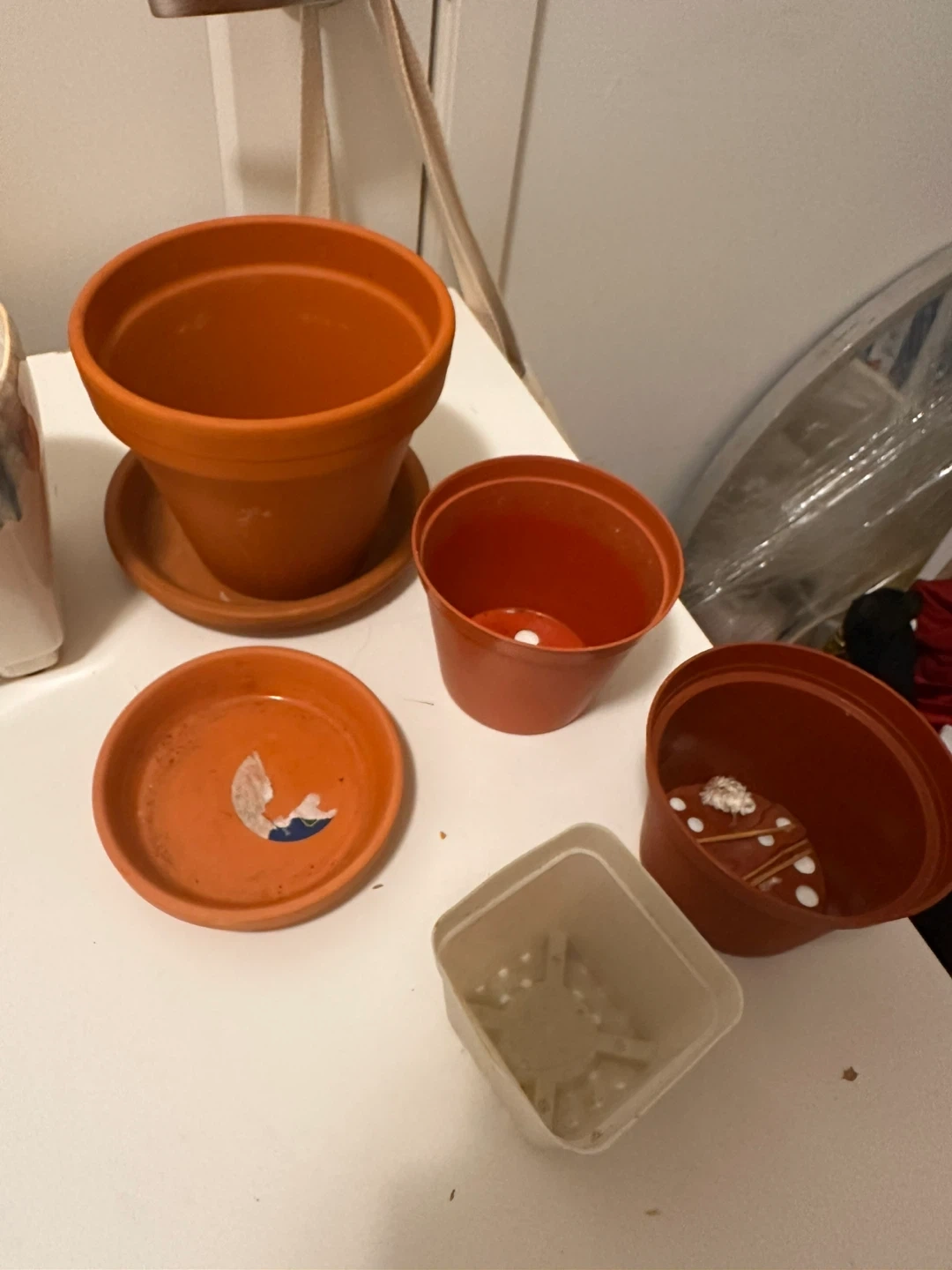 Selling a collection of used flower pots and a hanging planter. There are various sizes, colours, and styles.