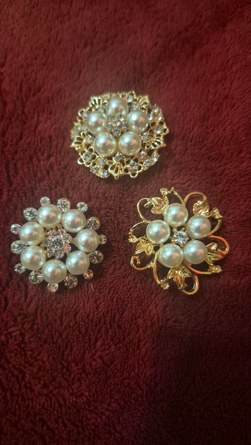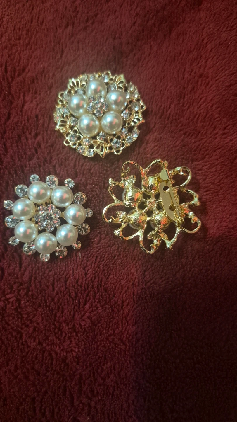 Selling a set of three lovely brooches! They feature faux pearls and rhinestones in a gold-tone setting. Perfect for adding a touch of elegance to any outfit or accessory..all 3 for $8