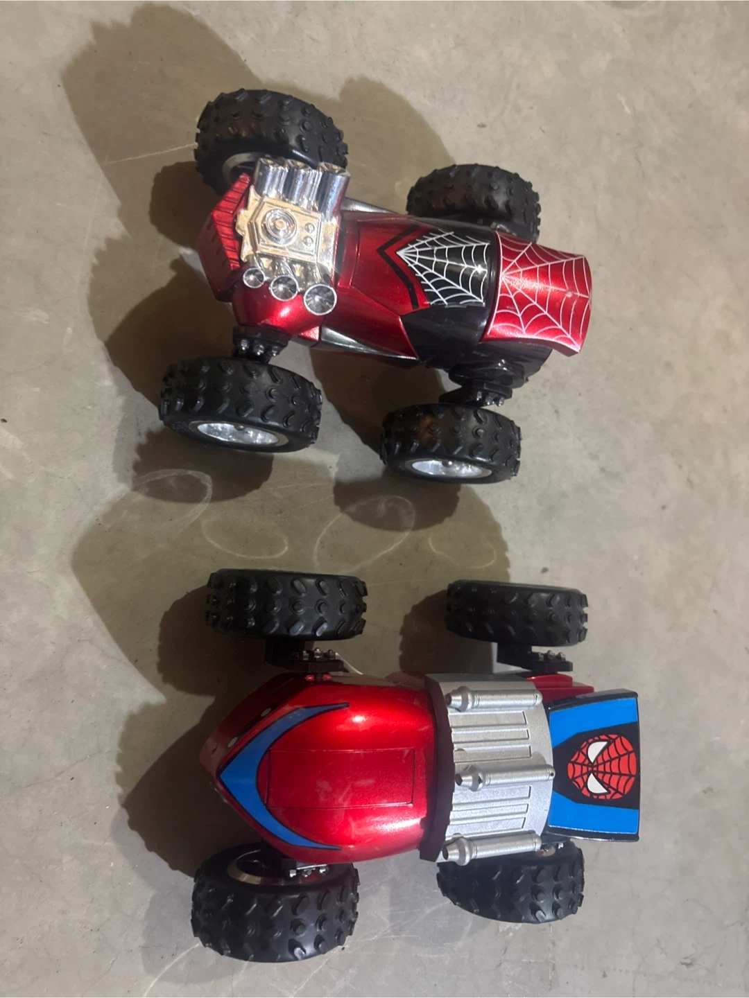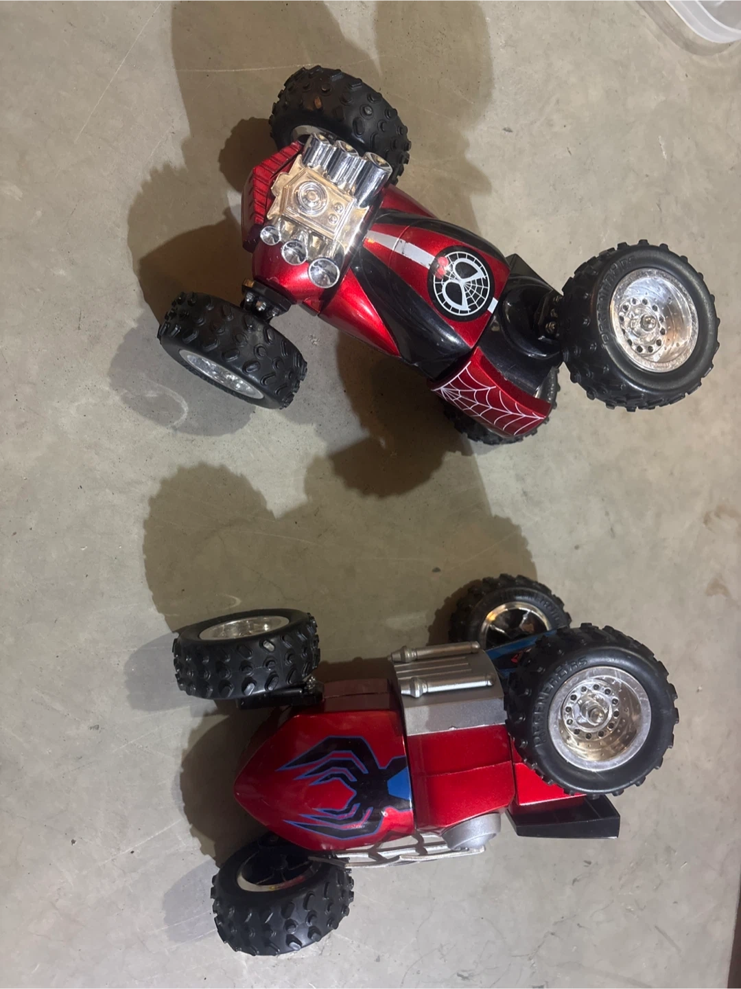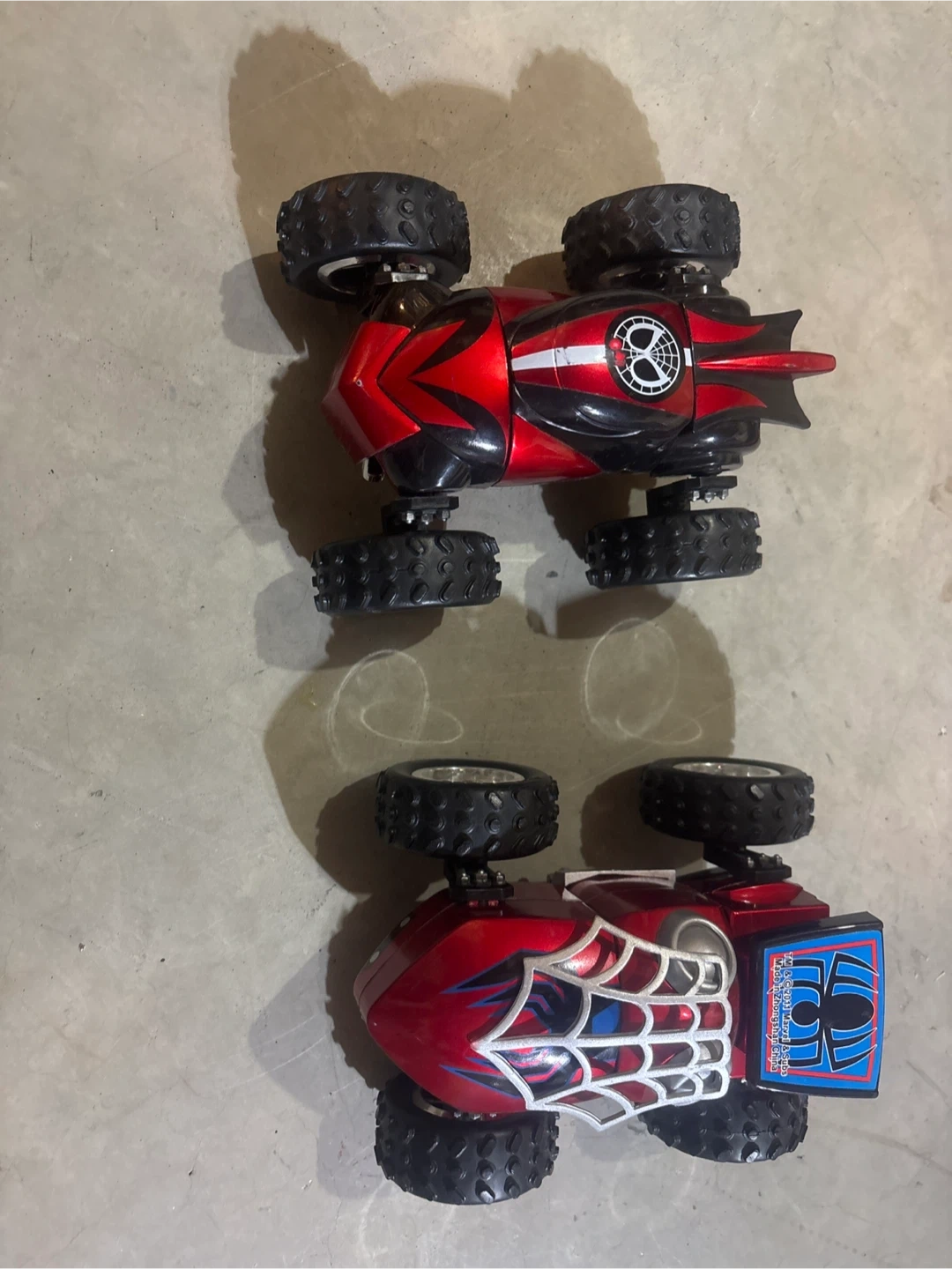 Two red customizable cars with Spiderman 3 rotating segments These cars have large, flippable tires. Fun for kids who love Spiderman toy cars