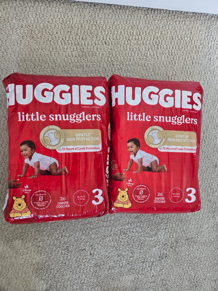 Selling two packs of Huggies Little Snugglers diapers, size 3. Each pack contains 26 diapers, perfect for babies weighing 16-28 lbs (7-13 kg). They offer gentle skin protection and up to 12 hours of leak protection!