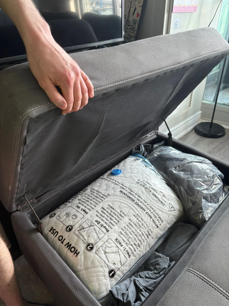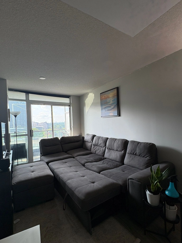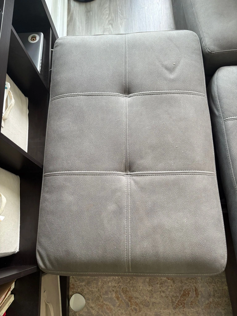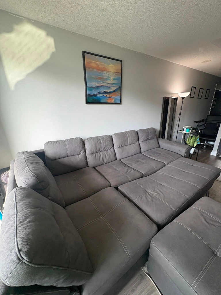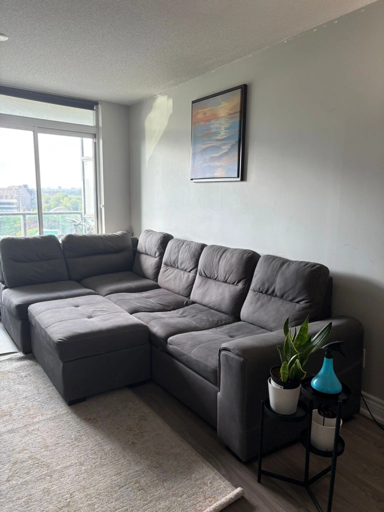 Selling a comfy grey L shaped sectional sofa with a handy storage ottoman! It's in good condition and perfect for lounging and relaxing in your living room. The ottoman provides extra seating and a convenient place to store blankets or other items. Great for small spaces!