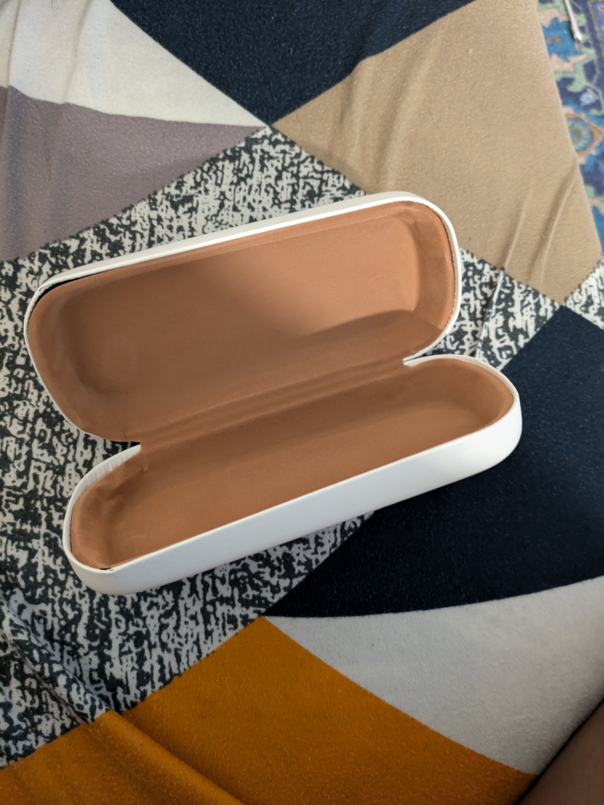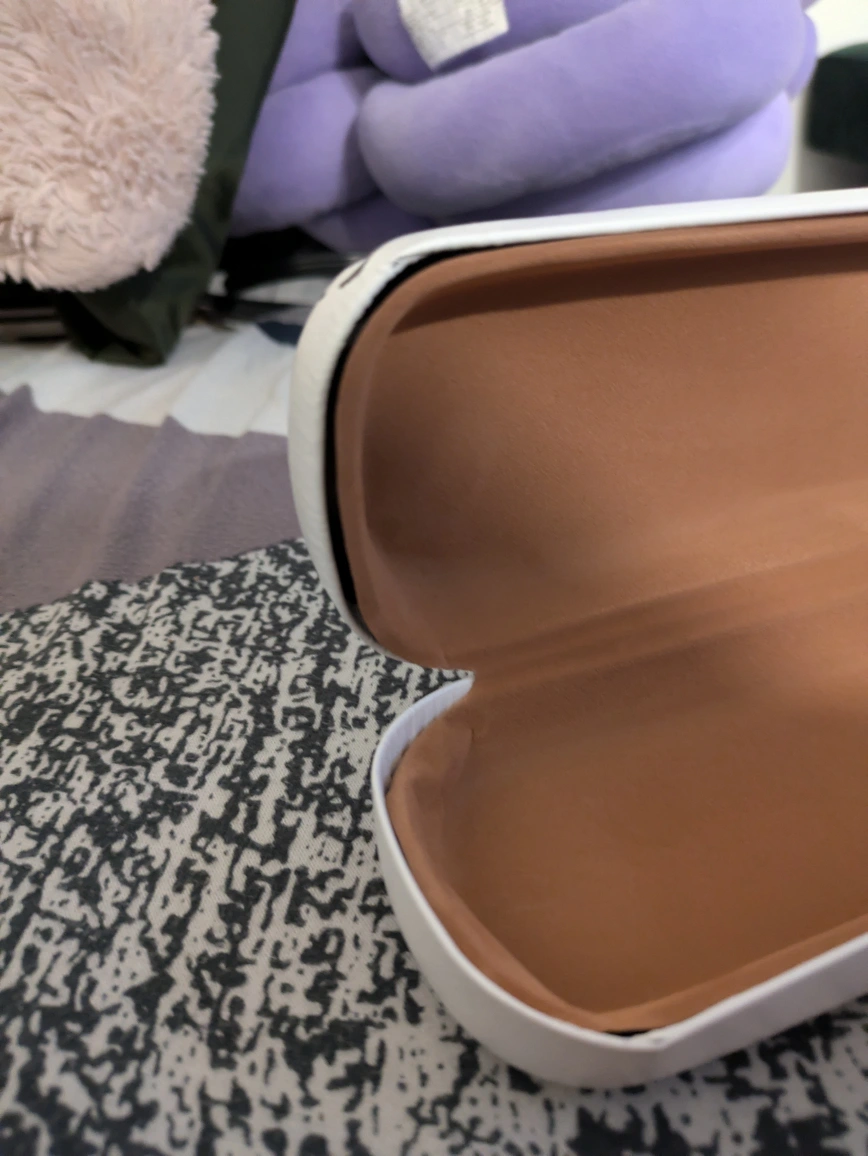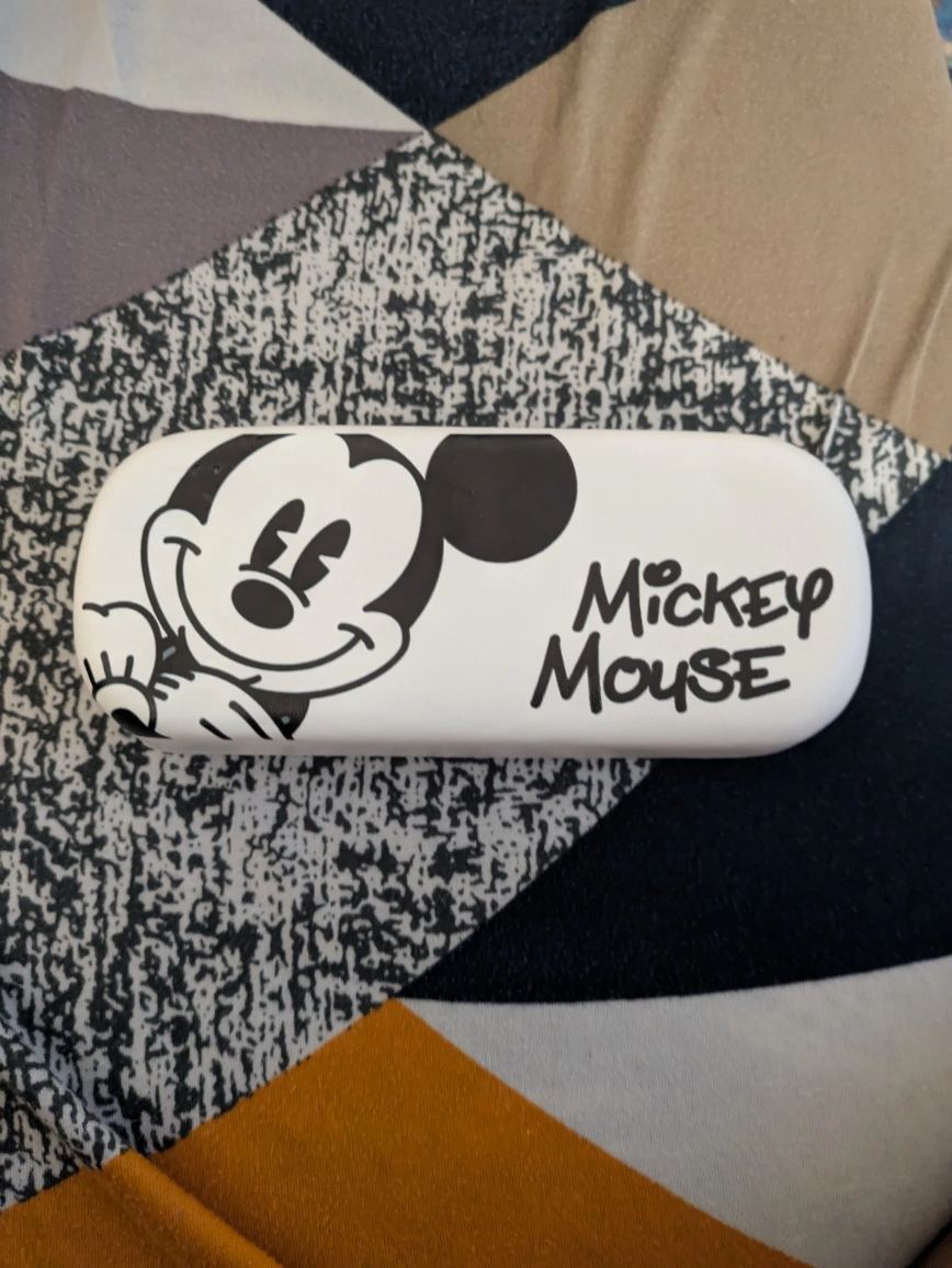 Here's a cute Mickey Mouse eyeglasses case! It's white with a Mickey Mouse design on the front and a brown interior. It's in good condition and ready to protect your glasses! See photos. - Pick up is pipeline road