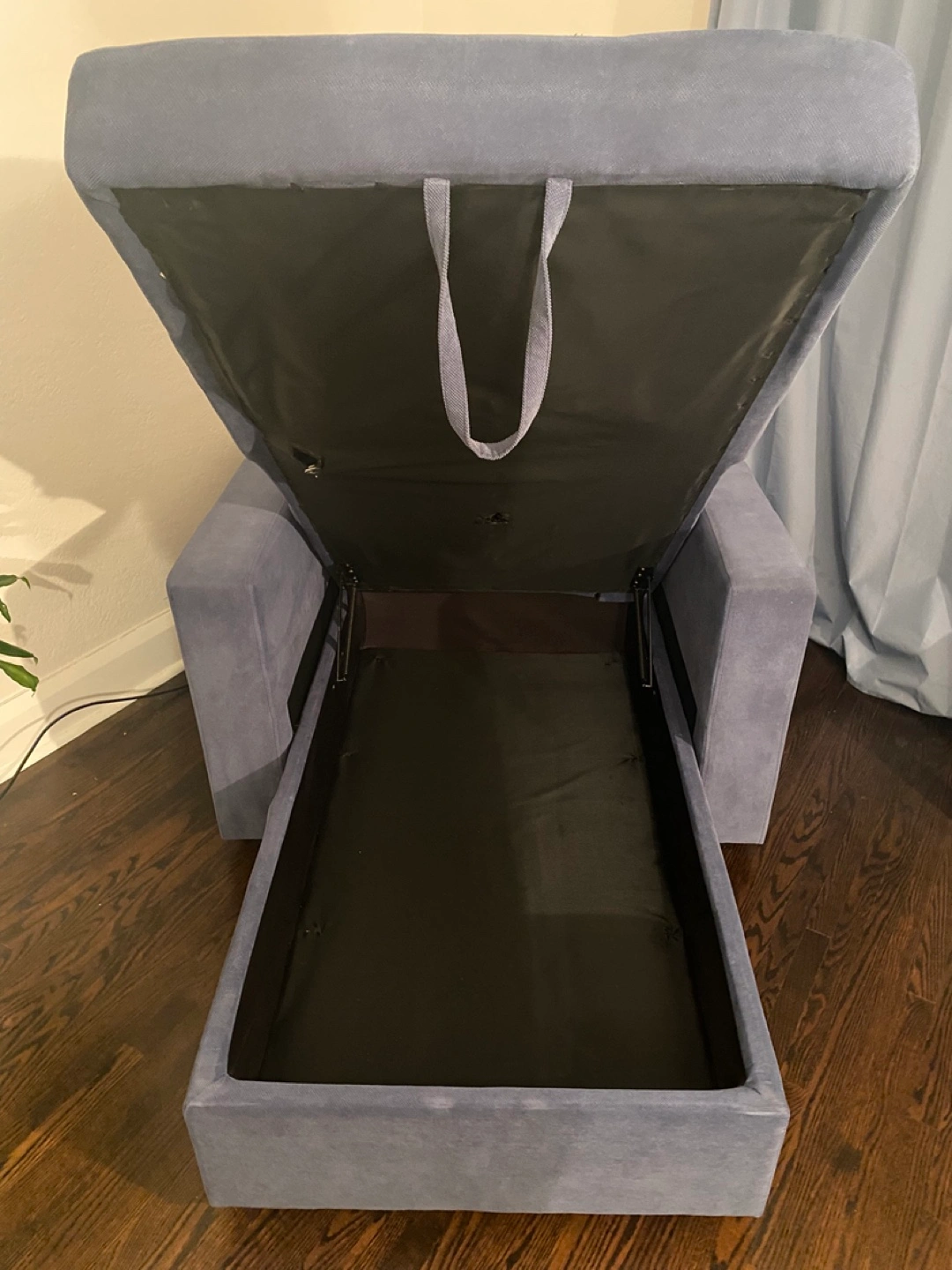 Convertible armchair that folds out into a single bed. It has a handy storage compartment underneath the seat cushion. Great for small spaces or guest rooms.