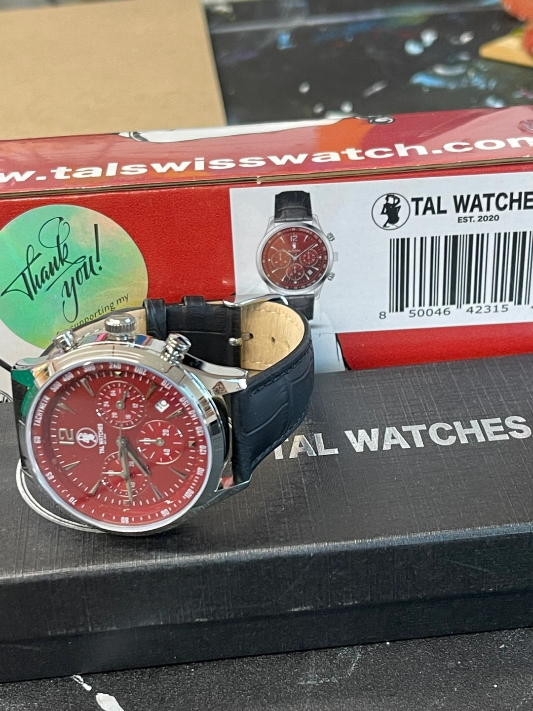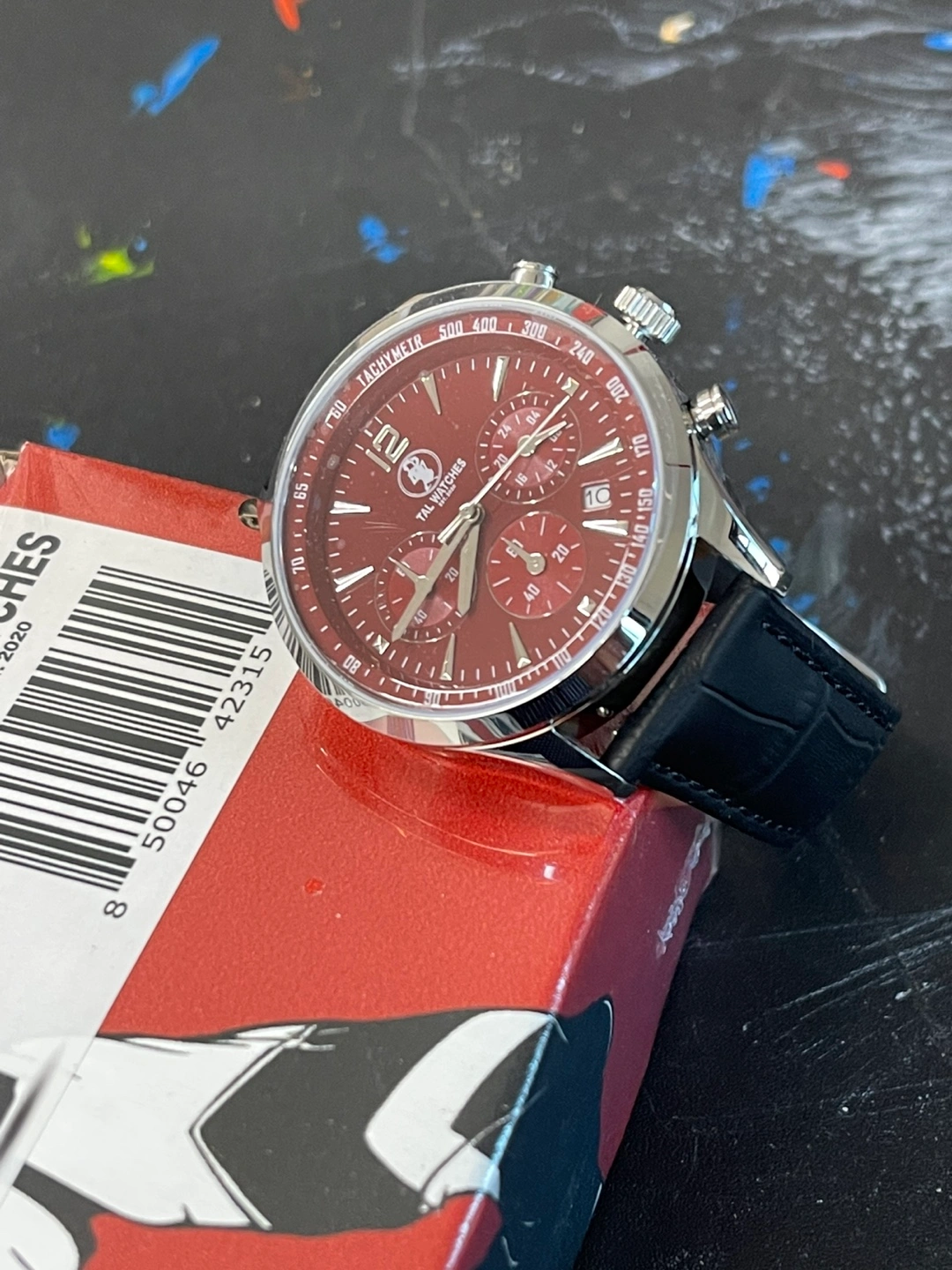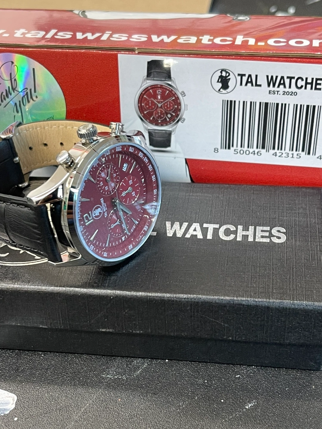 Selling a stylish TAL Watches chronograph watch with a burgundy face and a black leather band. It comes with its original box! The watch features a stainless steel back and is water-resistant. Perfect for adding a touch of sophistication to your look