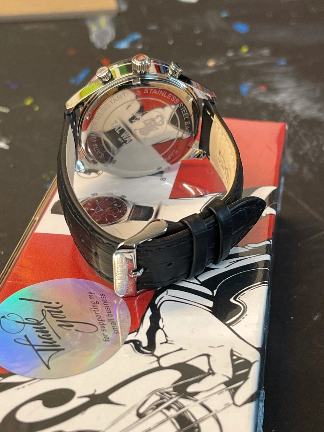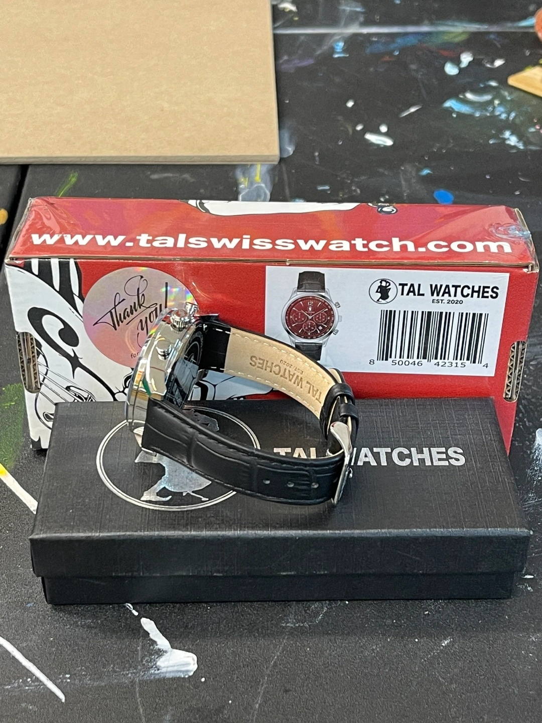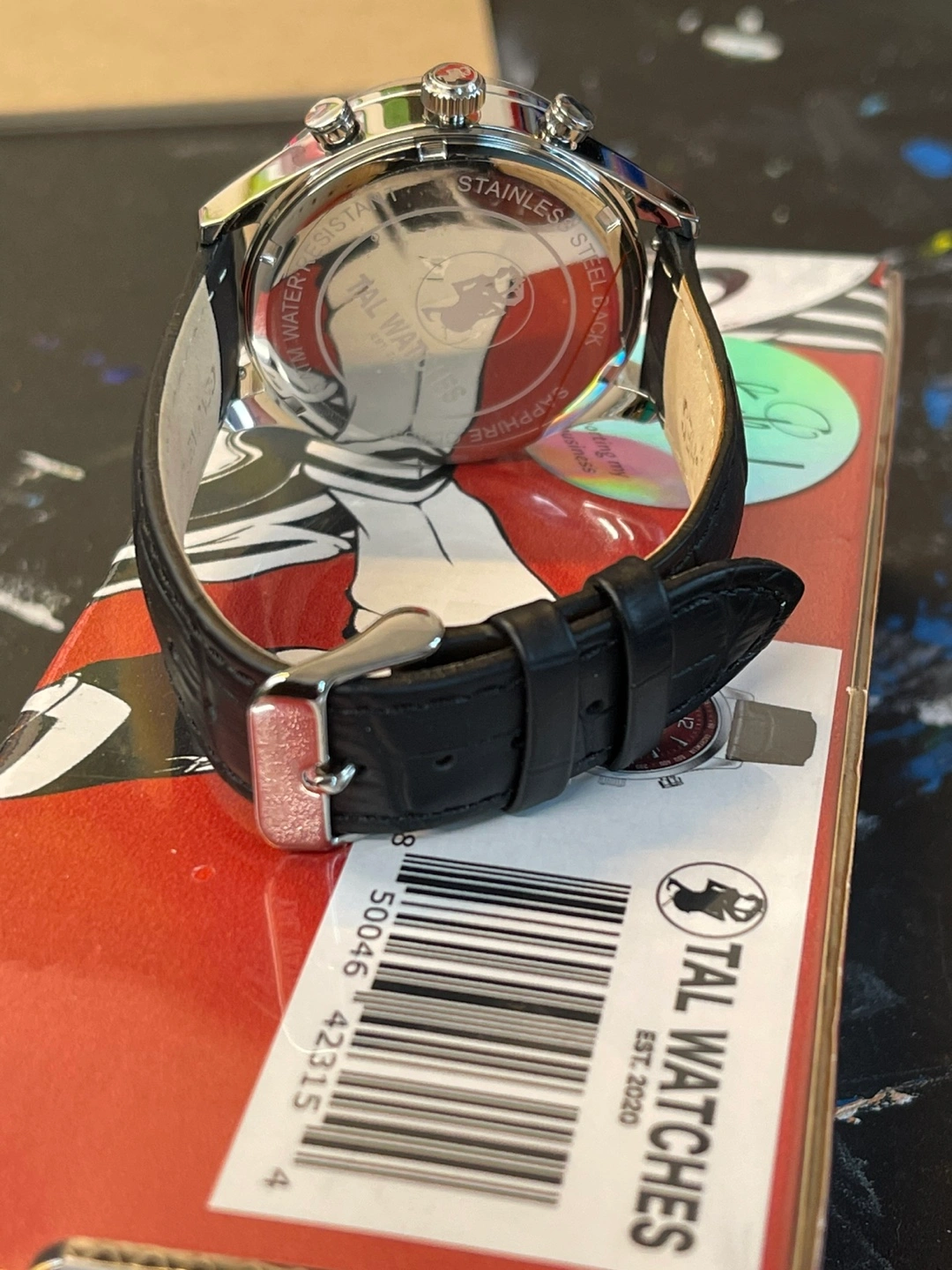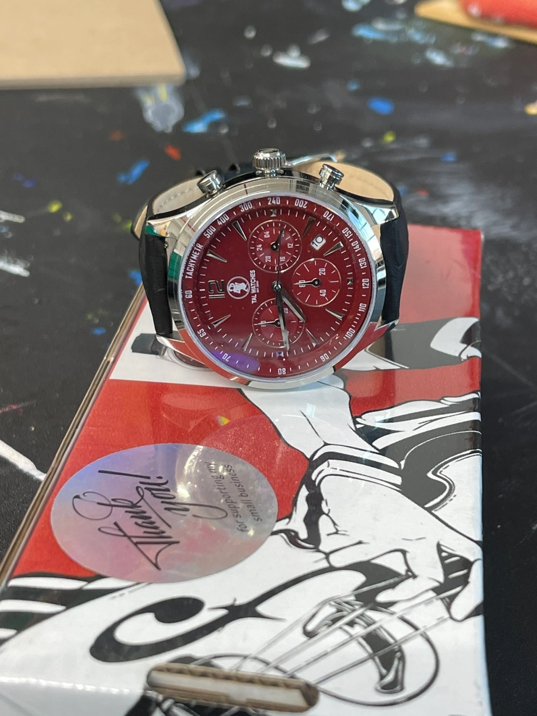 Selling a stylish TAL Watches chronograph watch with a burgundy face and a black leather band. It comes with its original box! The watch features a stainless steel back and is water-resistant. Perfect for adding a touch of sophistication to your look