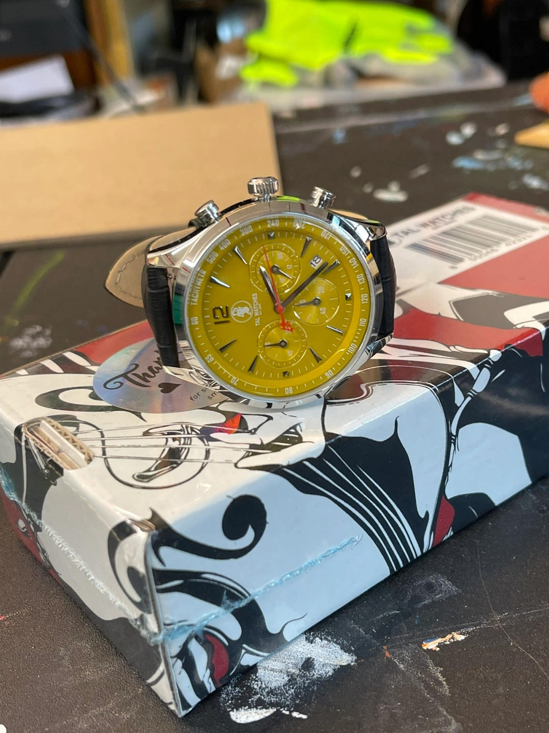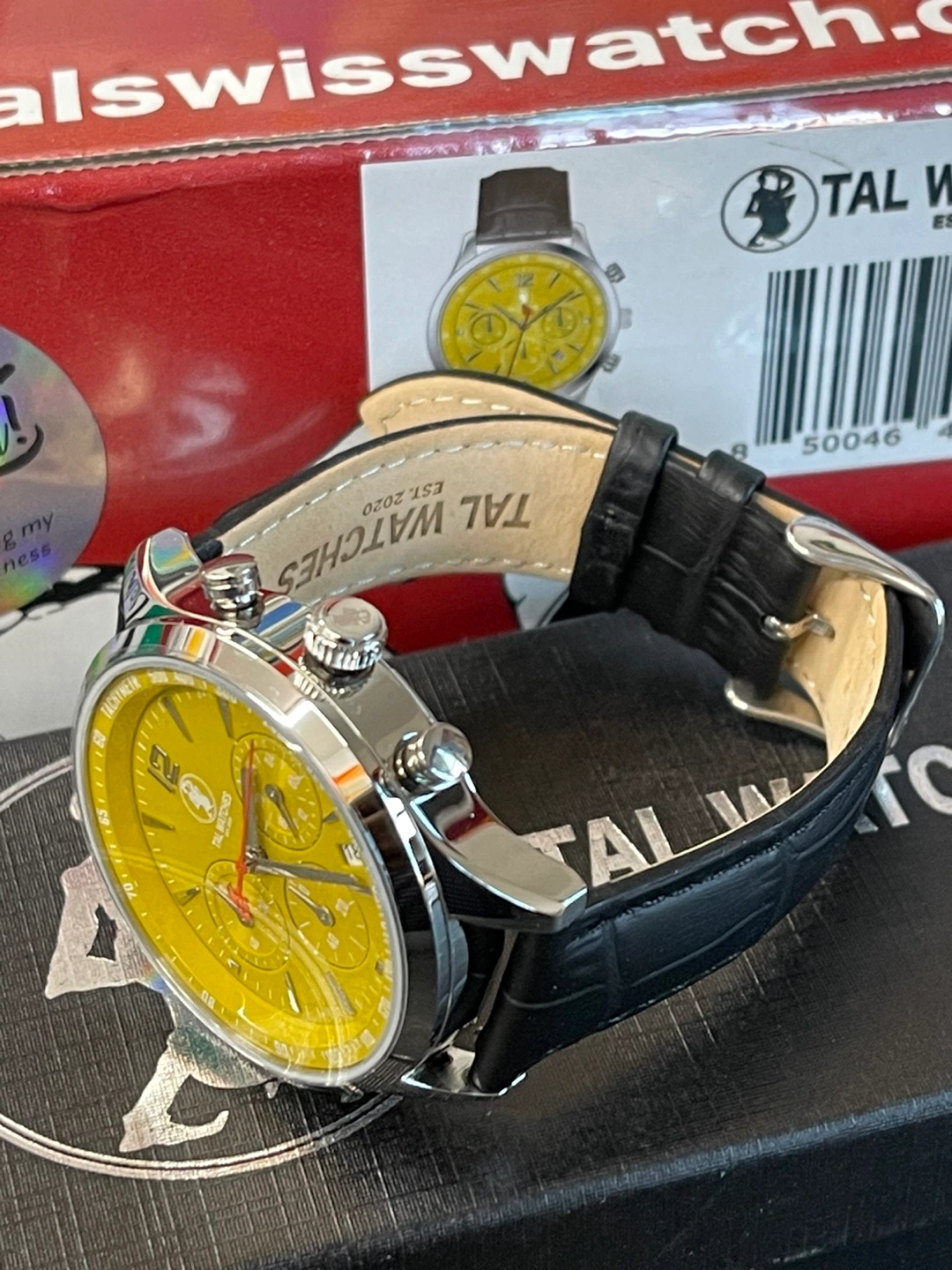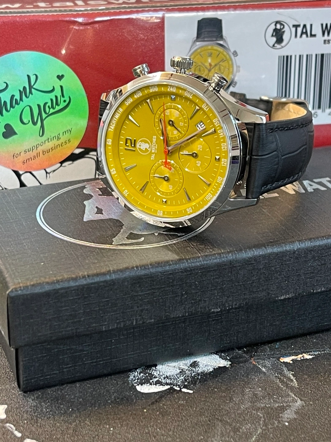 I'm selling a TAL Watches chronograph watch with a striking yellow face and black leather band. It's in great condition and comes with its original box. This watch is a real statement piece!