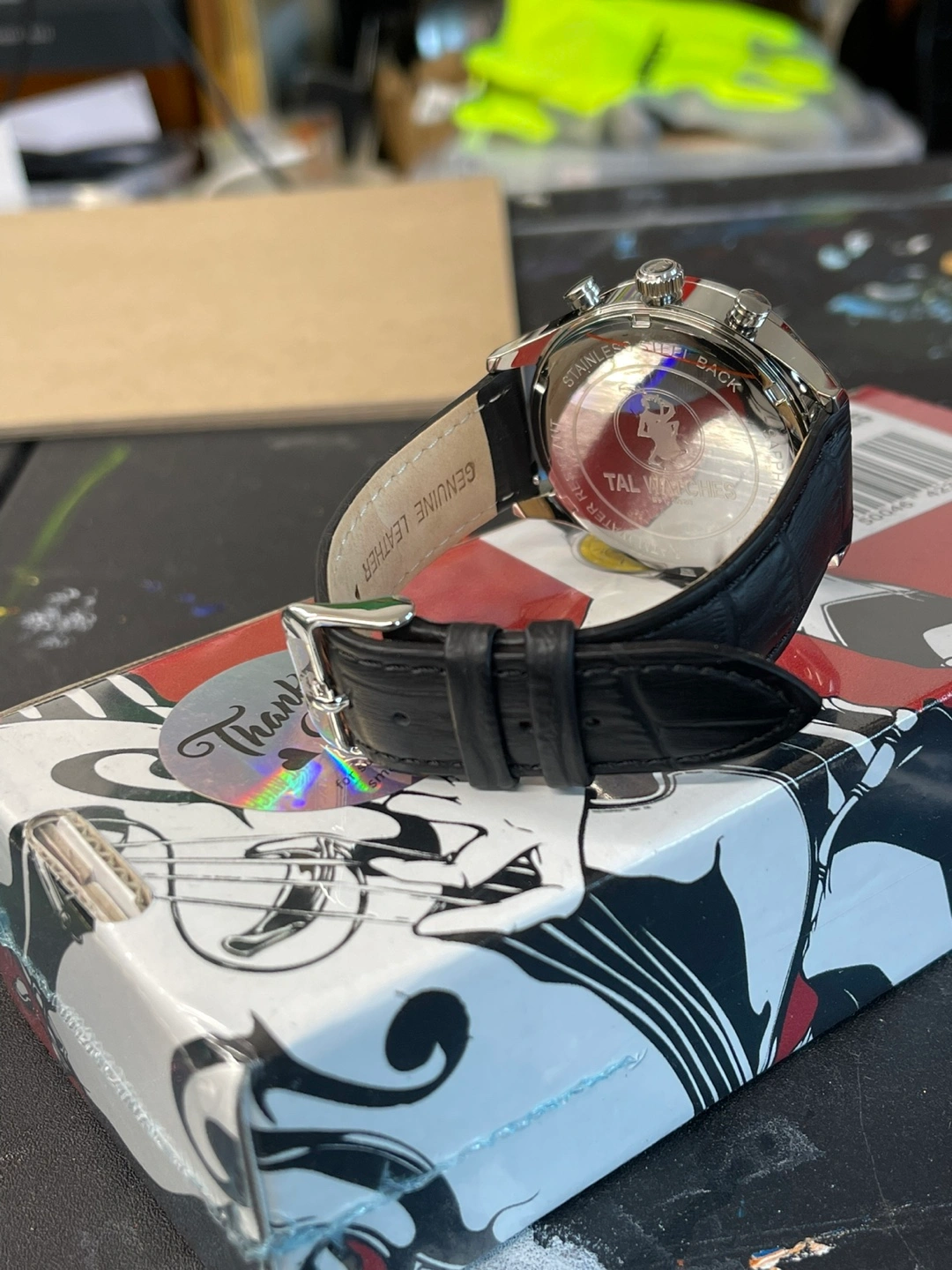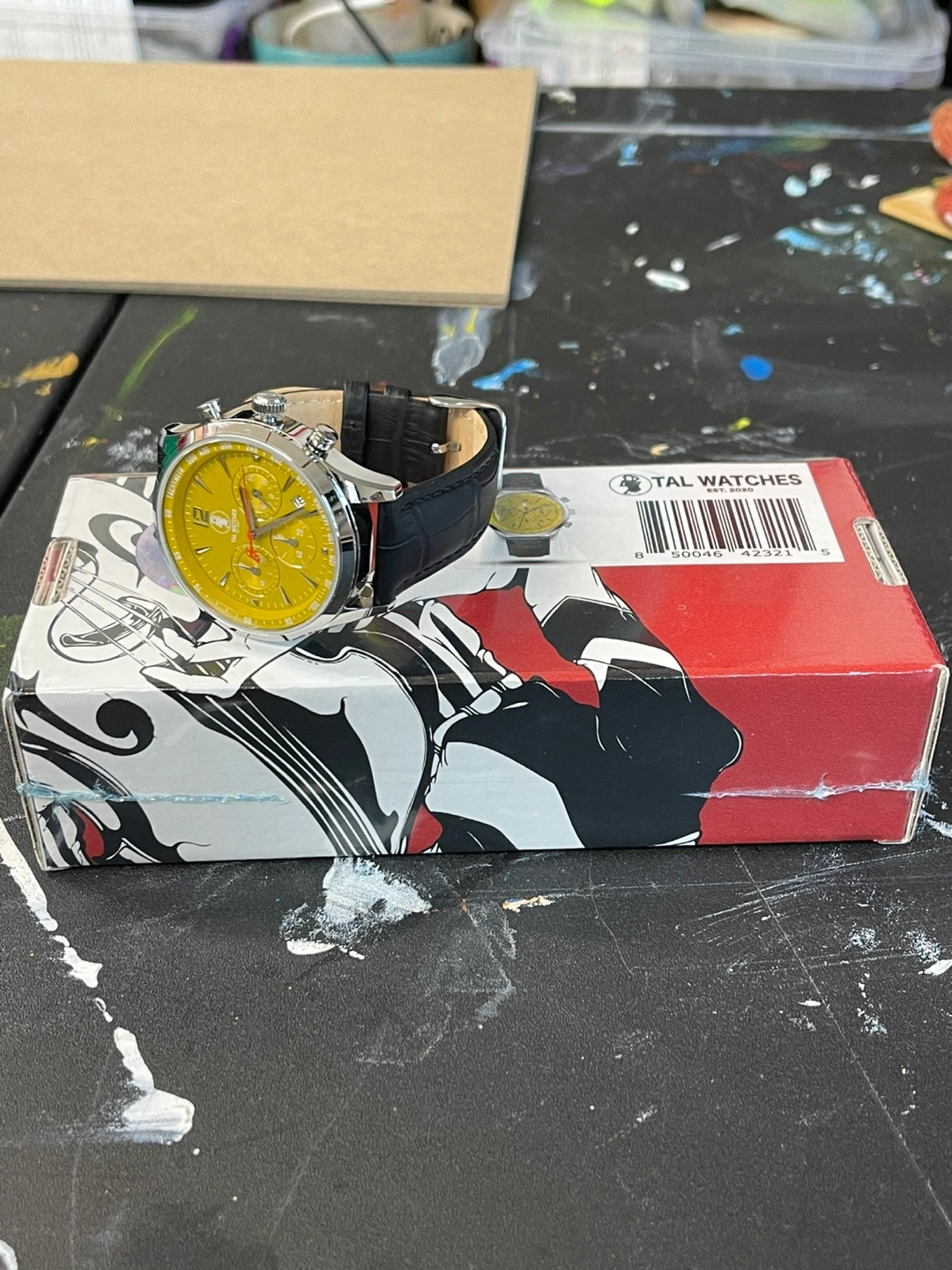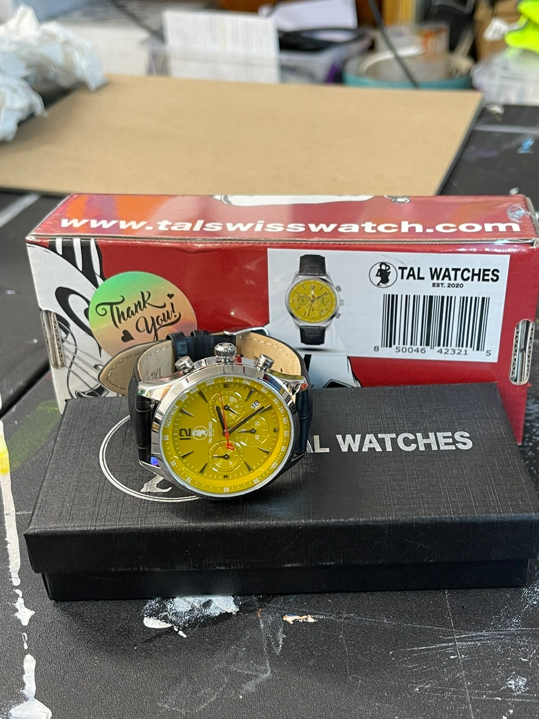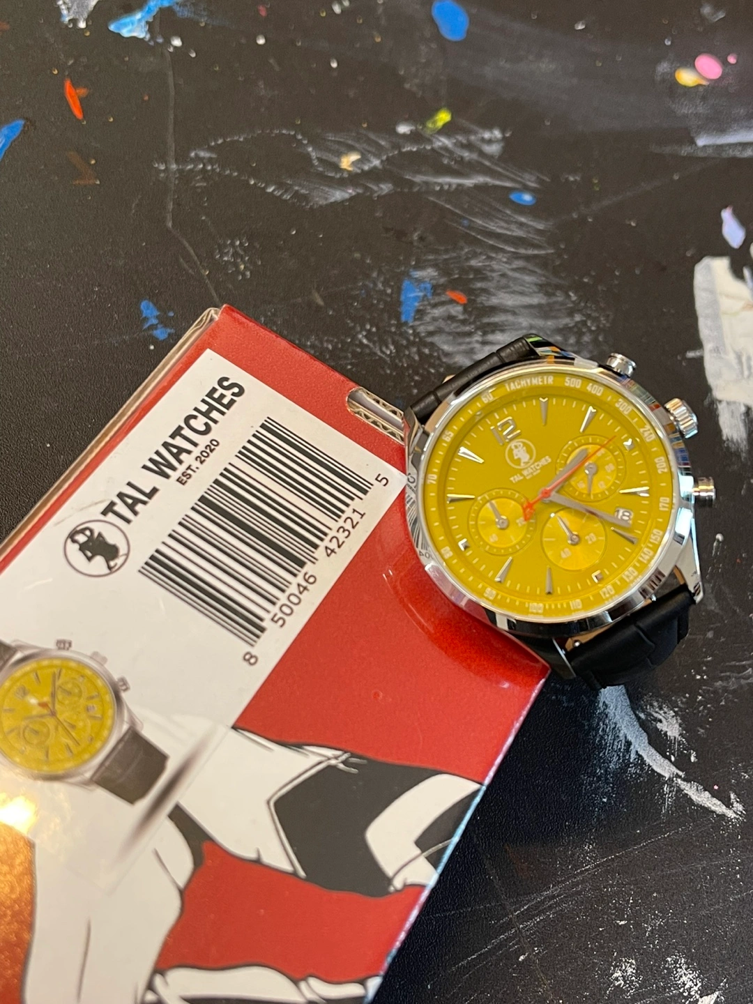 I'm selling a TAL Watches chronograph watch with a striking yellow face and black leather band. It's in great condition and comes with its original box. This watch is a real statement piece!