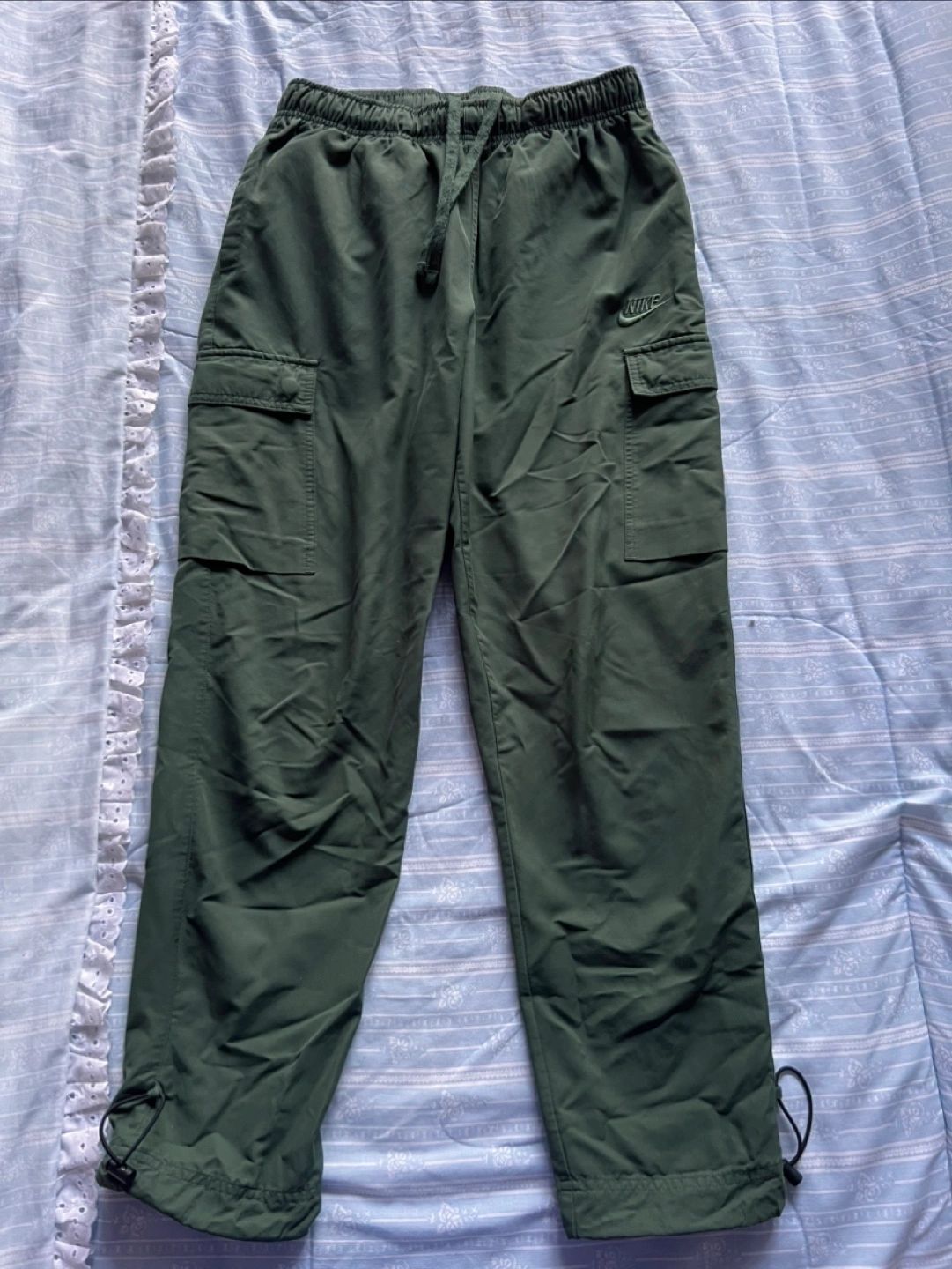 Selling a pair of Men’s Nike cargo pants in olive green. They're a size small and in great condition! These pants feature a comfortable elastic waistband and adjustable drawstrings at the ankles. Perfect for casual wear or outdoor activities