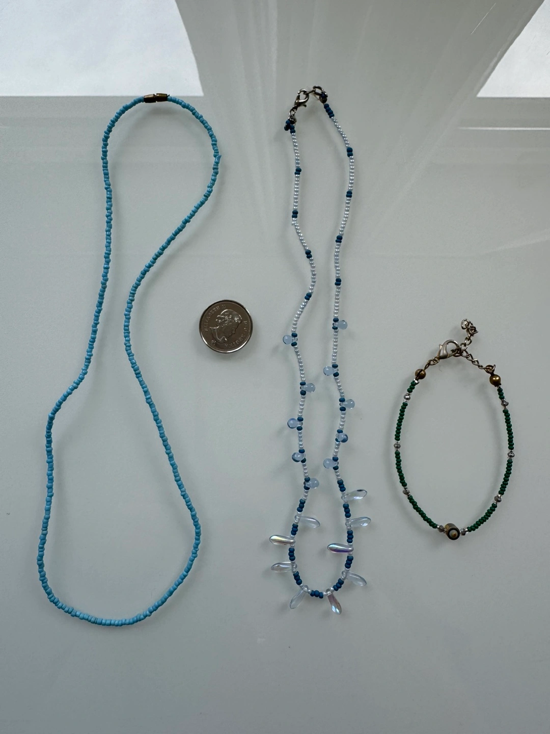 1000+Selling a cute handmade beaded necklace and bracelet set! One of the necklaces is turquoise and the other has varying shades of blue with teardrop beads. The bracelet is green and has the nazar symbol. This is handmade and purchased from MykonosZ