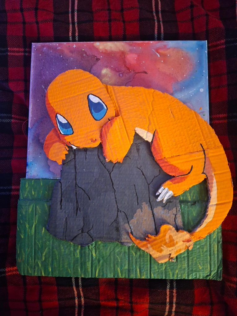 Selling a handmade Charmander art piece! This unique artwork features the beloved Pokémon character crafted from cardboard and painted with vibrant colours. It's a fun and whimsical addition to any room, especially for Pokémon fans